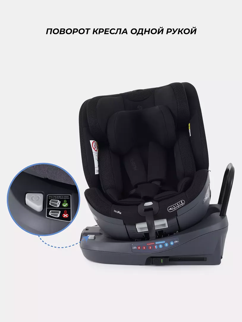 - главная особенность автокресла в уникальной поворотной платформе, которую достаточно один раз надежно зафиксировать с помощью isofix и далее спокойно поворачивать на все 360 градусов. Таким образом, облегчается смена положения кресла - по ходу/против хода; значительно проще посадить/достать малыша, ведь кресло можно развернуть боком, а затем выставить либо по ходу, либо против хода движения;