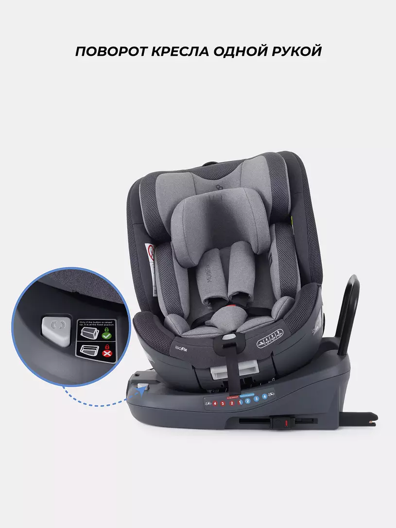 главная особенность автокресла в уникальной поворотной платформе, которую достаточно один раз надежно зафиксировать с помощью isofix и далее спокойно поворачивать на все 360 градусов. Таким образом, облегчается смена положения кресла - по ходу/против хода; значительно проще посадить/достать малыша, ведь кресло можно развернуть боком, а затем выставить либо по ходу, либо против хода движения; -