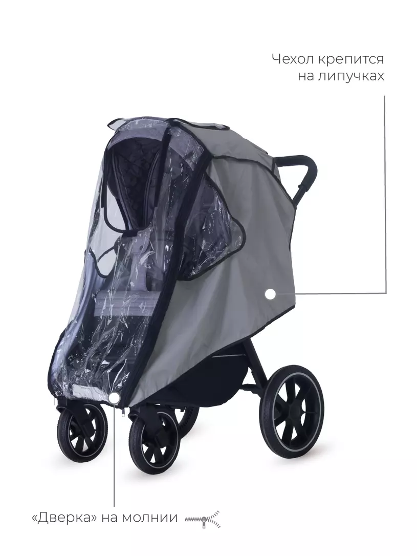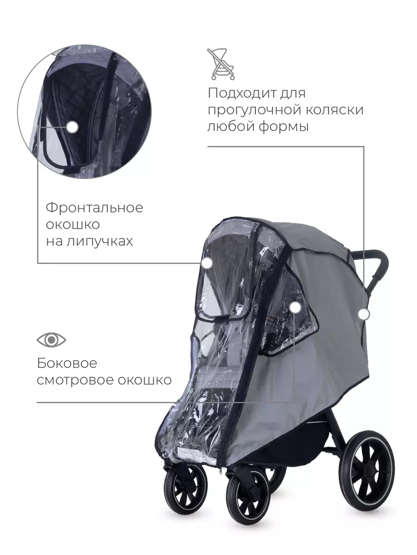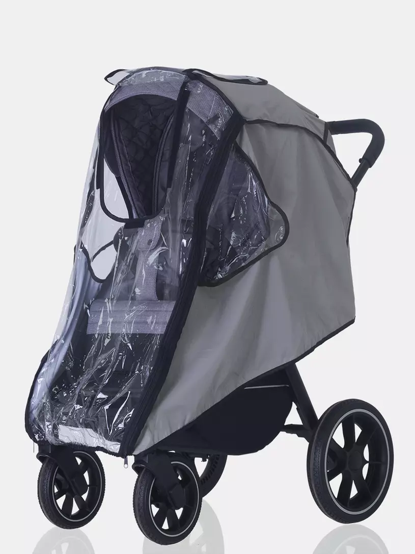 Универсальный дождевик последнего поколения для прогулочной коляски надежно защитит вашего малыша от осадков и сильного ветра. Аксессуар надежно фиксируется, имеет три смотровых окошка на липучках, "дверку" на молнии и сумку-чехол.