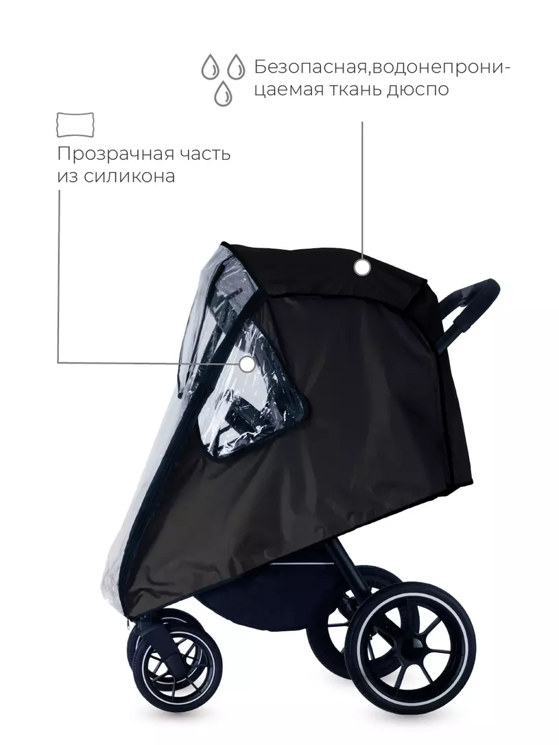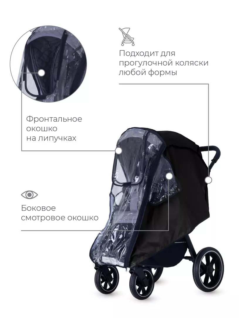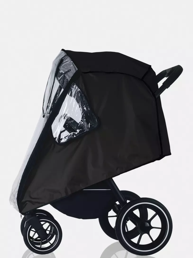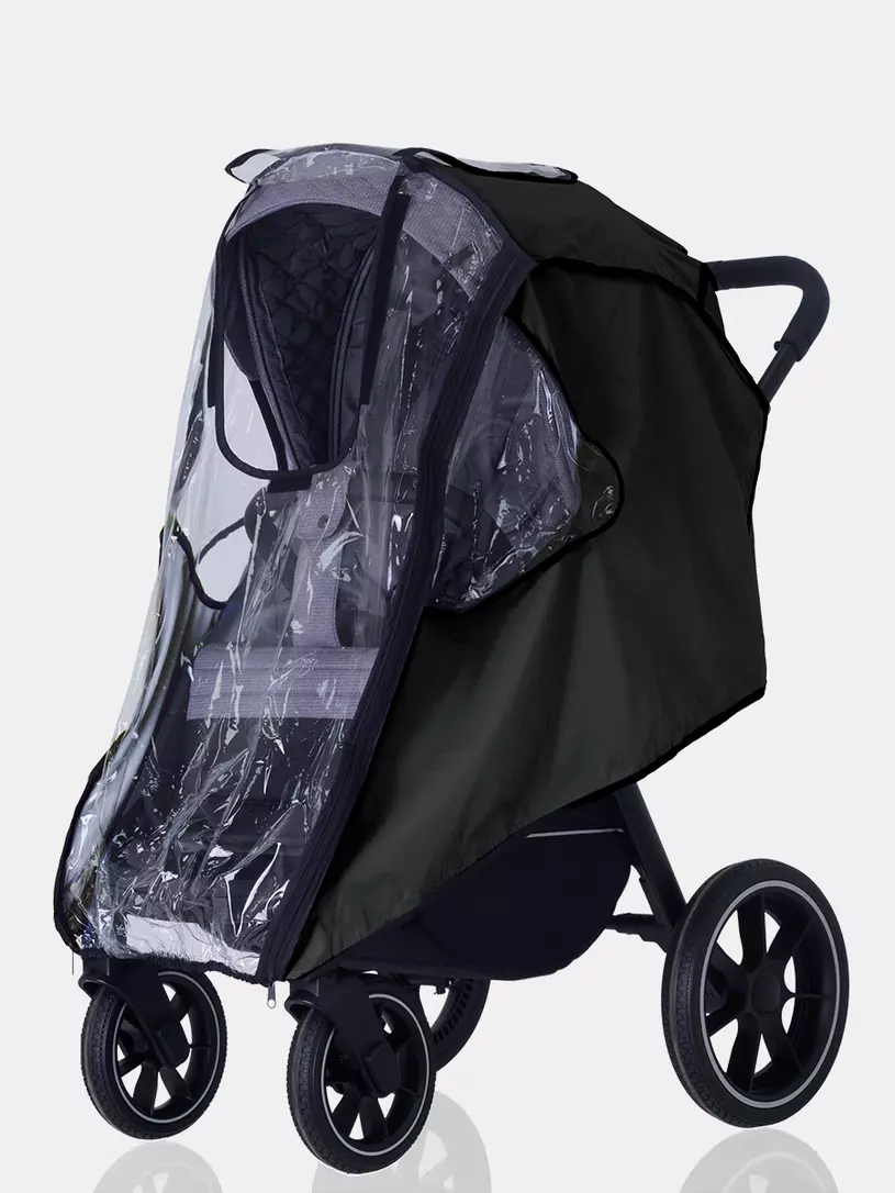 Универсальный дождевик последнего поколения для прогулочной коляски надежно защитит вашего малыша от осадков и сильного ветра. Аксессуар надежно фиксируется, имеет три смотровых окошка на липучках, "дверку" на молнии и сумку-чехол.