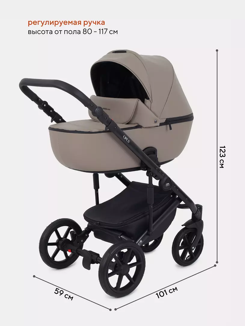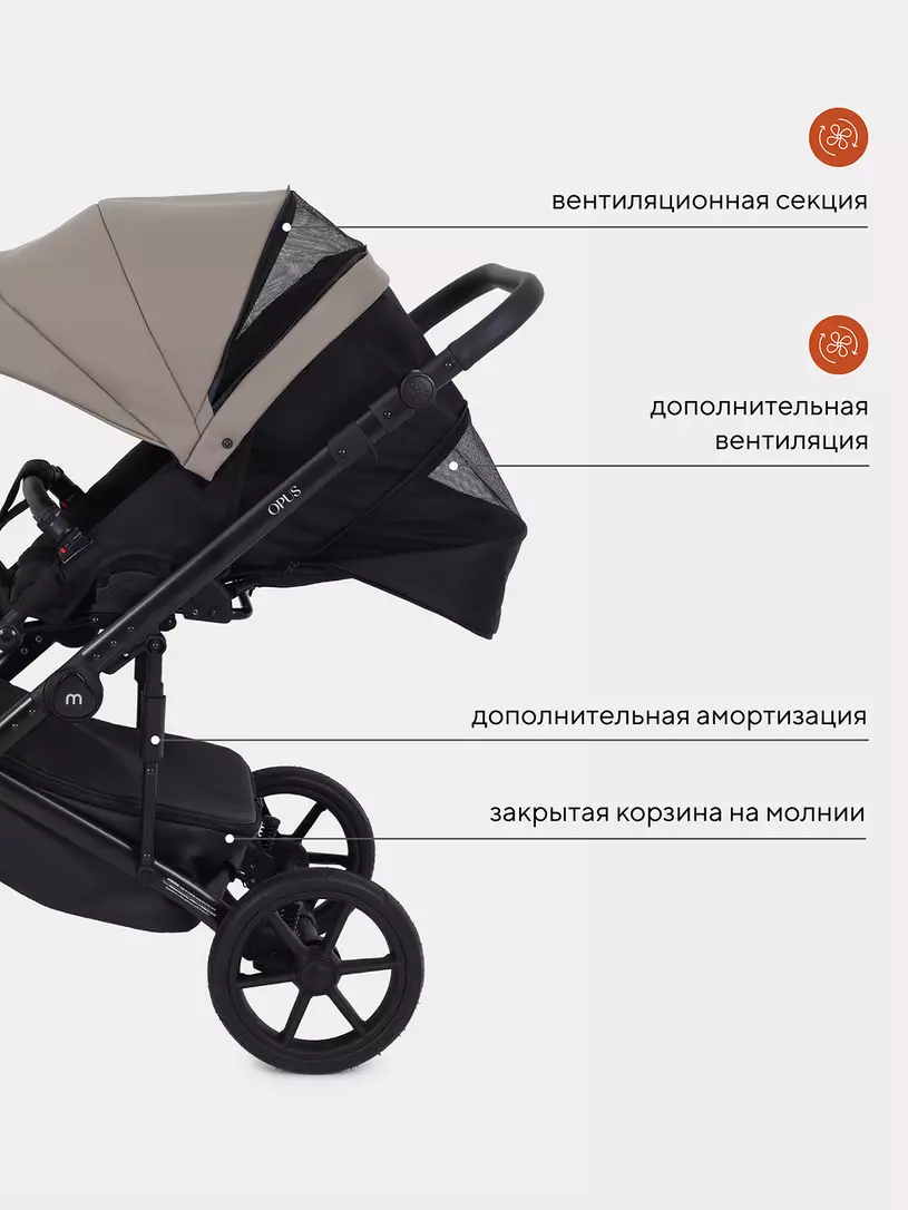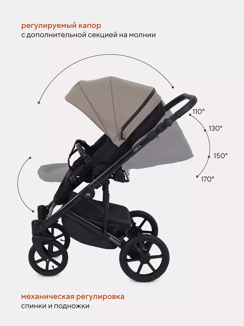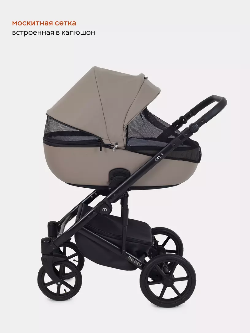 Детская коляска 2 в 1 Mowbaby Opus покорит вас: встроенной в капюшон москитной сеткой, двойной амортизацией, регулировкой спинки люльки снаружи блока, ветрозащитными отворотами на магнитах в обоих блоках (спальном и прогулочном).