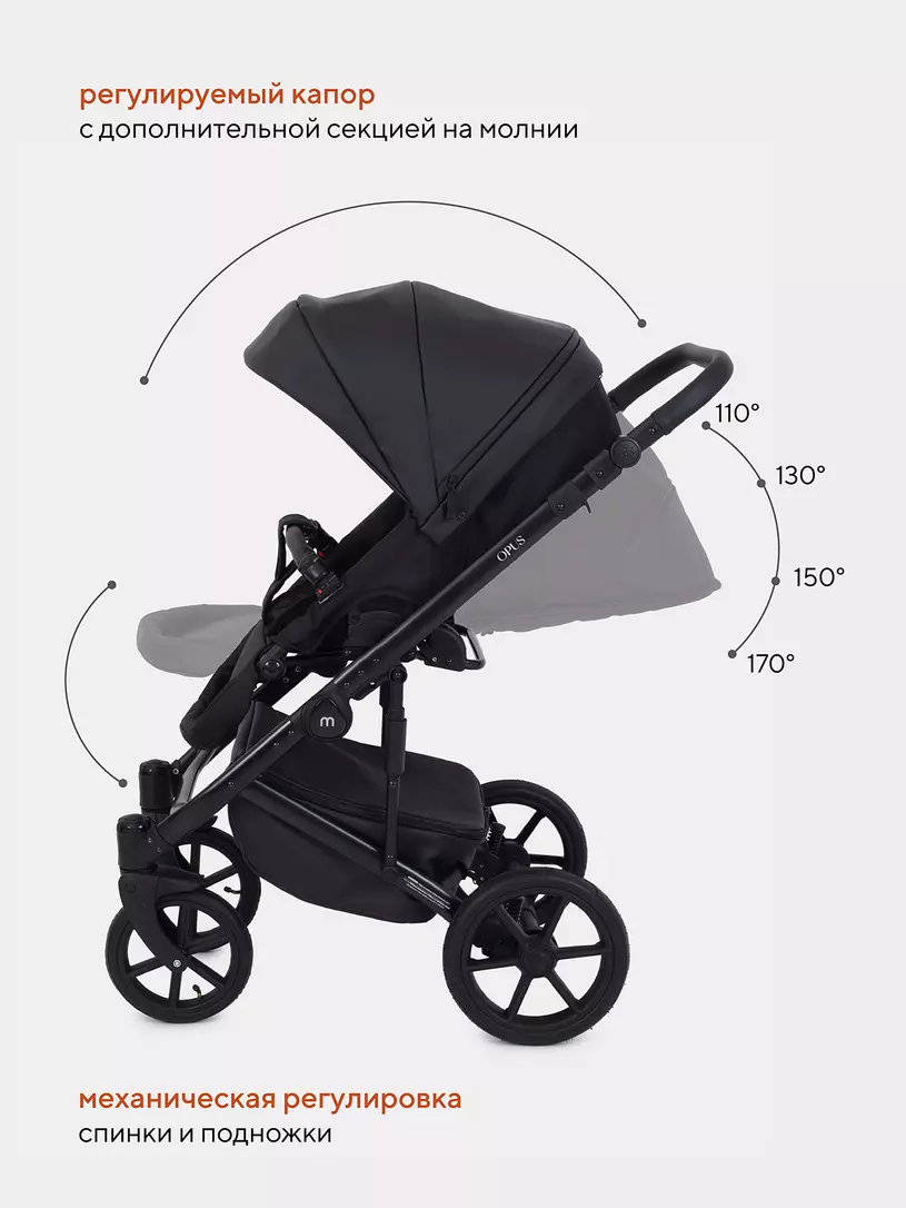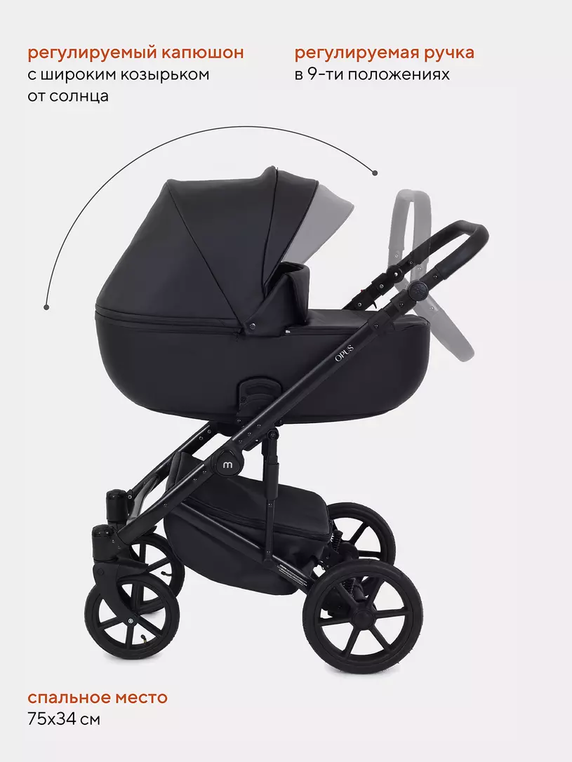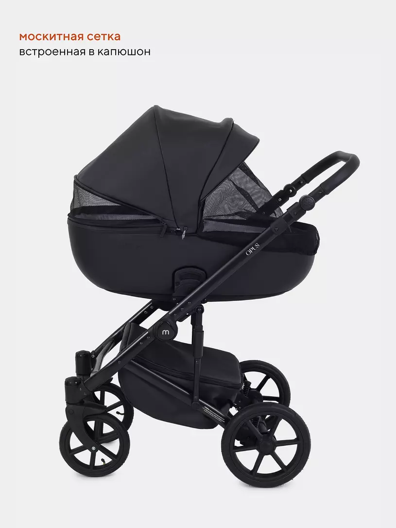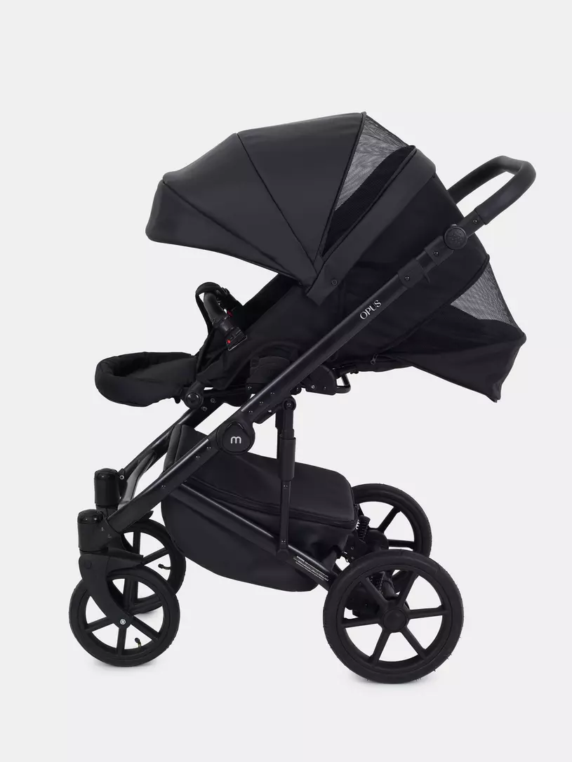 Детская коляска 2 в 1 Mowbaby Opus покорит вас: встроенной в капюшон москитной сеткой, двойной амортизацией, регулировкой спинки люльки снаружи блока, ветрозащитными отворотами на магнитах в обоих блоках (спальном и прогулочном).
