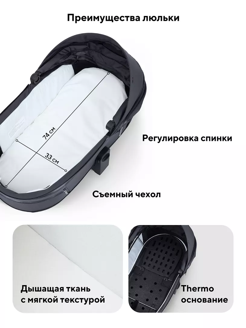 - абсолютная инновация модели - термолюлька. Особый материал, из которого выполнено основание, идеально поддерживает микроклимат внутри: на улице жарко - в люльке прохладно, на улице холодно - в люльке тепло. В то же время высокотехнологичный материал характеризуется легким весом и ударопрочностью.