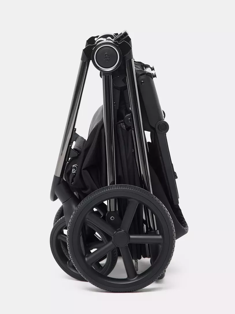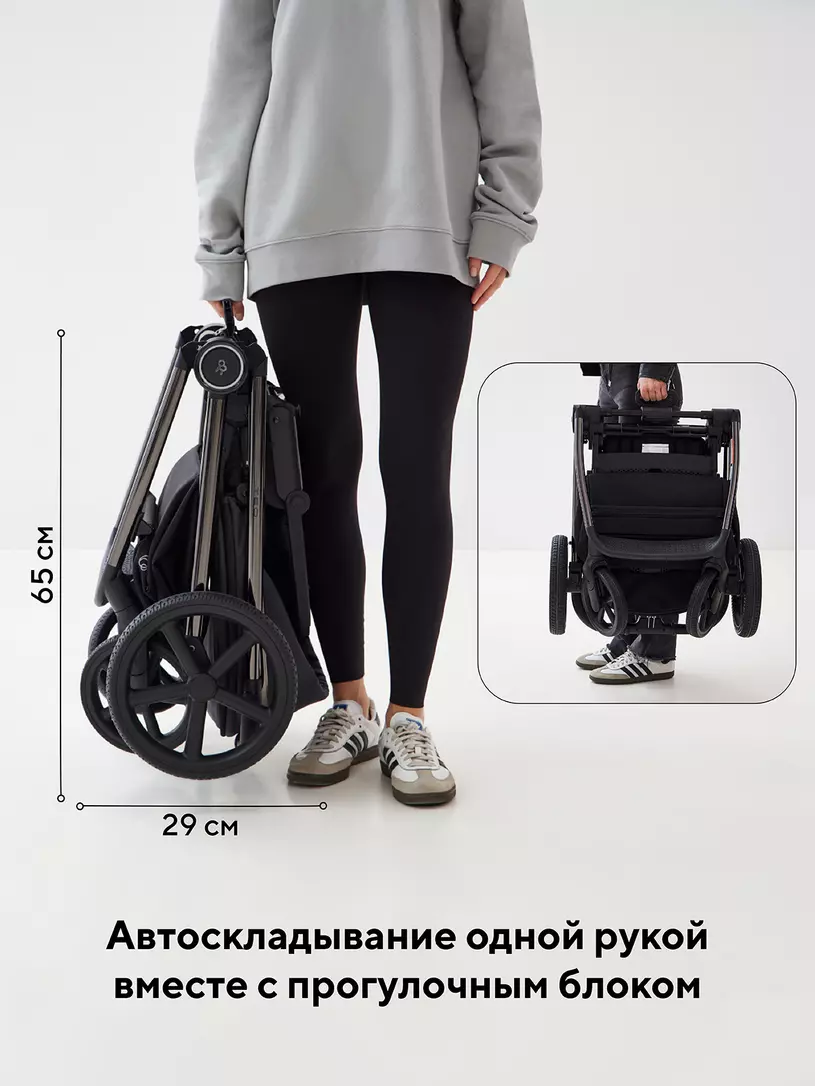 - коляска дополнена функцией автоскладывания - просто нажмите кнопку и слегка подтолкните подножку в обратную сторону. Модель складывается автоматически сразу вместе с блоком, независимо от его положения (по ходу/против хода).