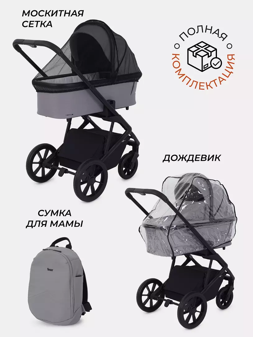 - богатая комплектация: стильный рюкзачок для мамы, дождевик, москитная сетка