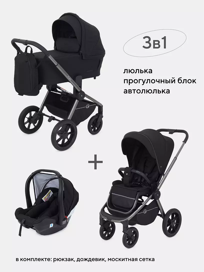 - модель дополнена богатой комплектацией: стильным рюкзаком для мамы, москиткой, дождевиком