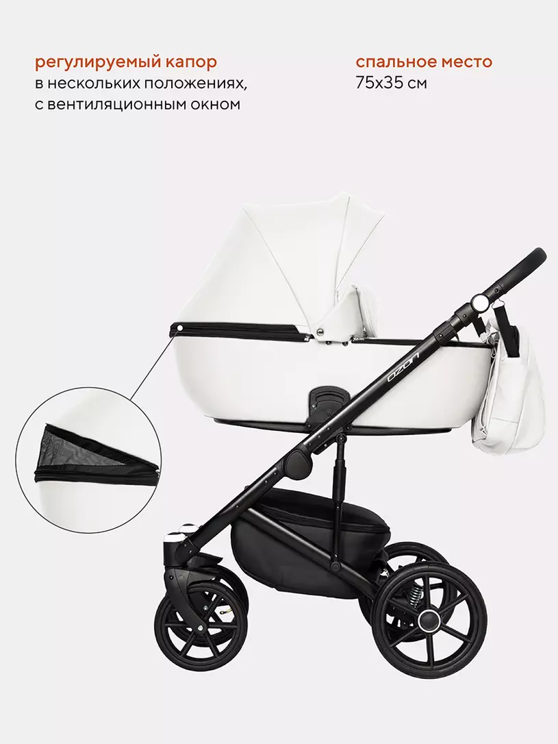 Детская коляска 3 в 1 RIKO BASIC OZON, дополненная автолюлькой, покорит вас: спинкой люльки, регулируемой с внешней стороны блока; москитной сеткой, встроенной в капюшон люльки; регулируемой вентиляцией в дне люльки; быстросъемными блоками.