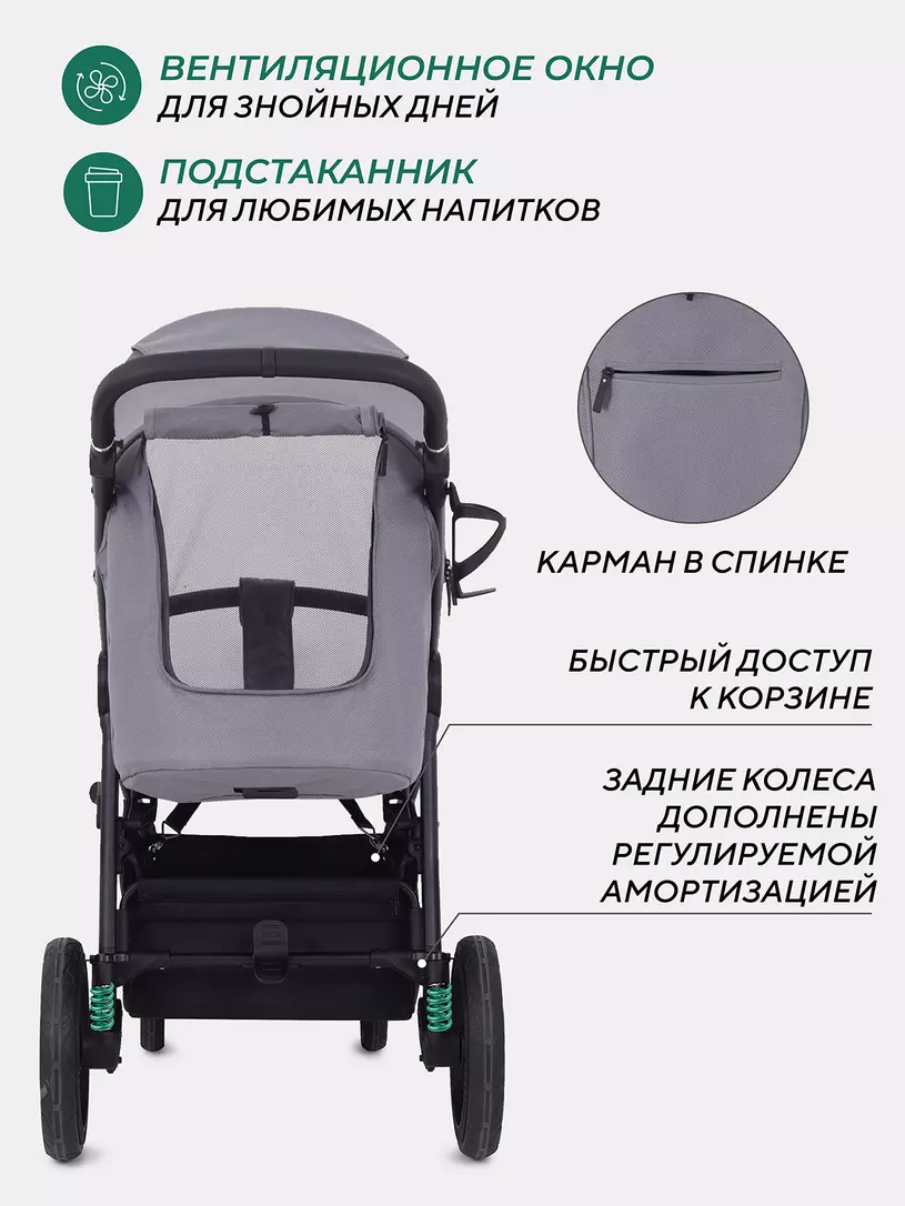 - задние колеса дополнены регулируемой амортизацией, что обеспечивает мягкий ход, независимо от веса ребенка