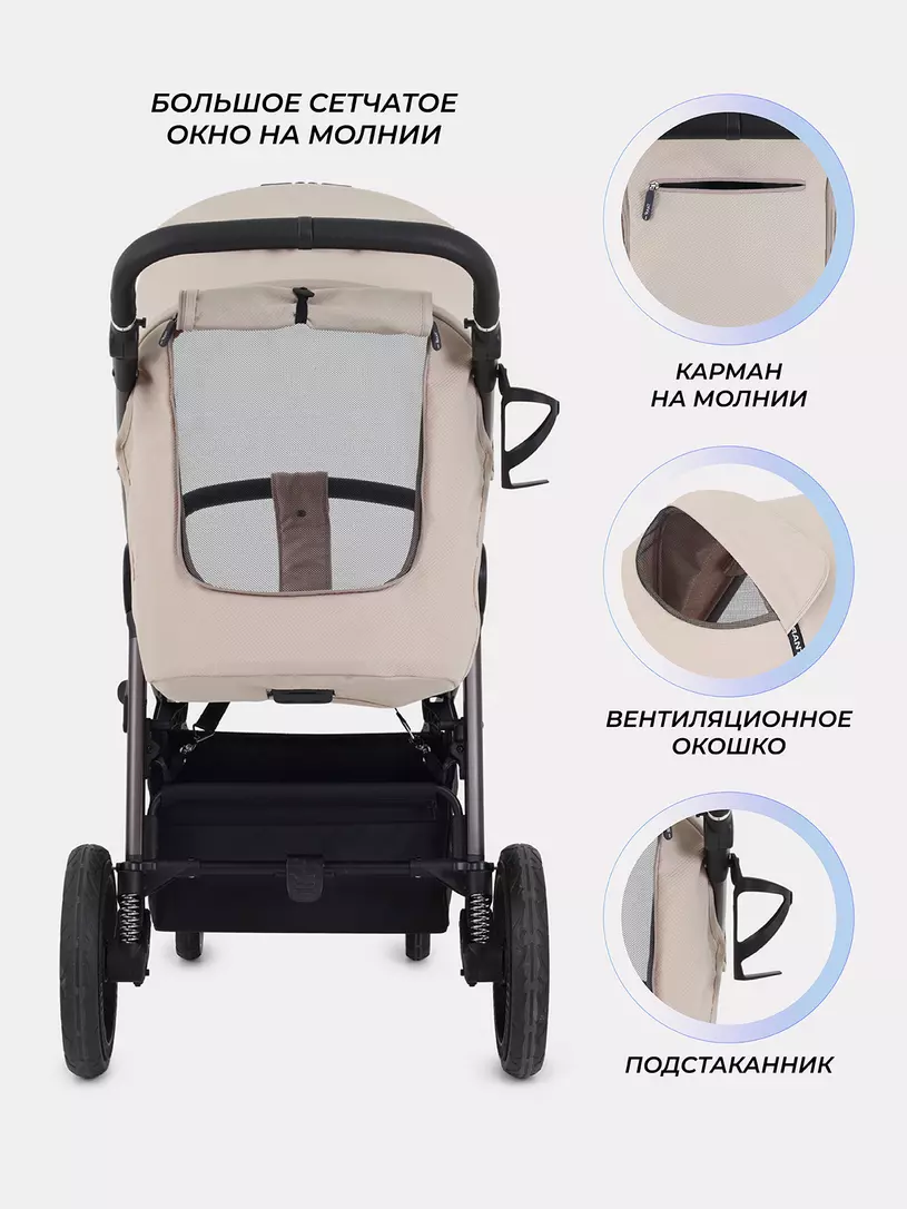 - главная инновация модели - бескамерные резиновые колеса, которые не требуют поддува. Благодаря им коляска легко преодолеет сложный ландшафт: сугробы, грязь, песок, гравий…