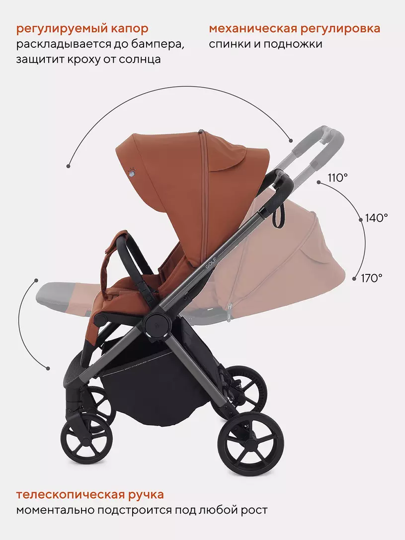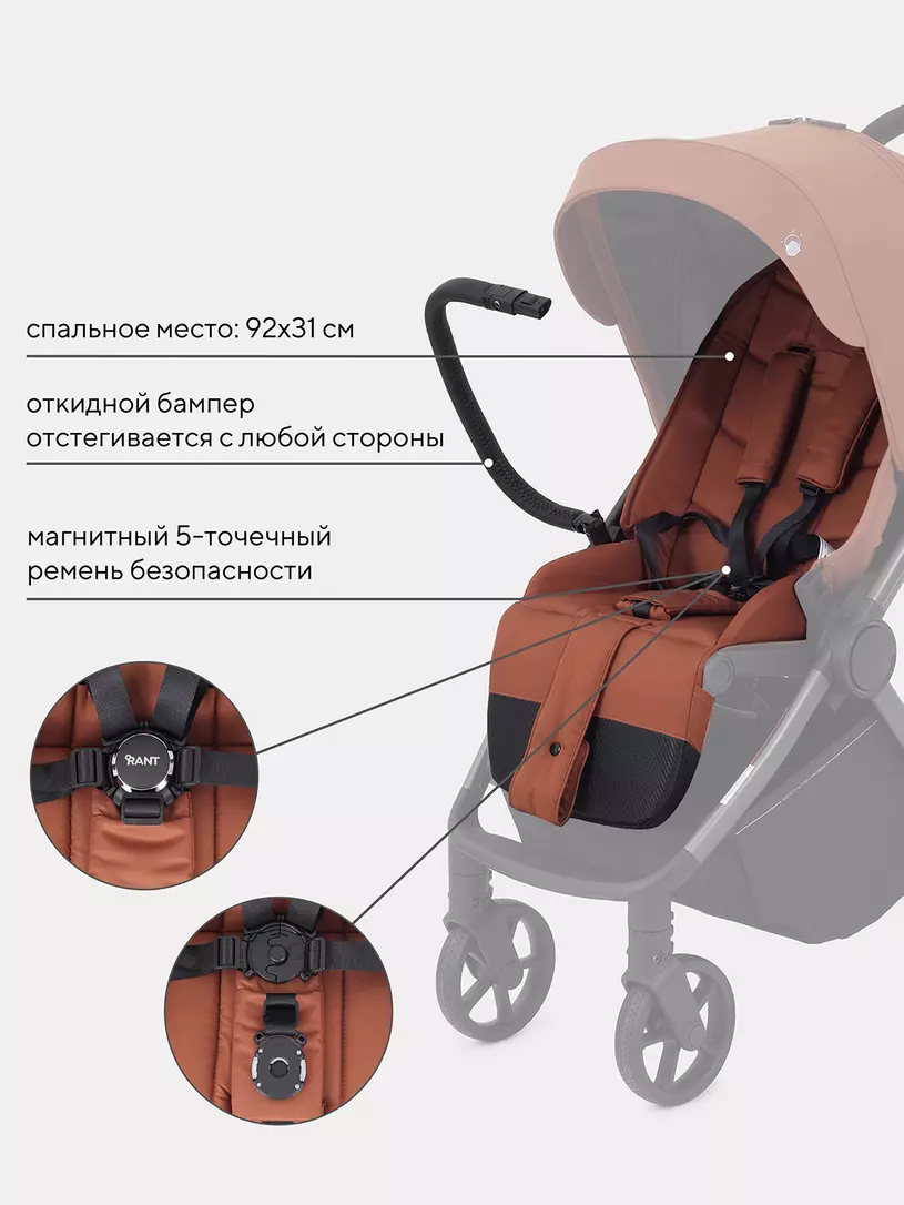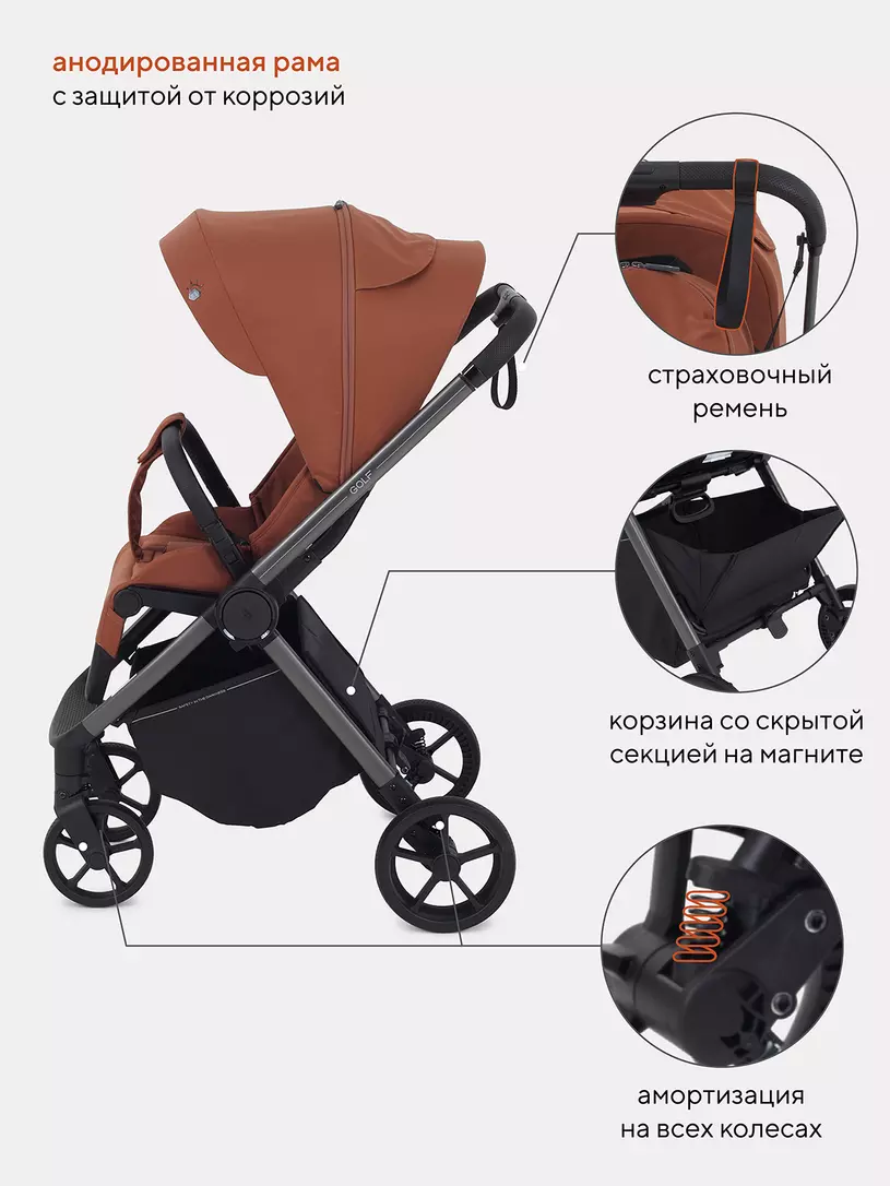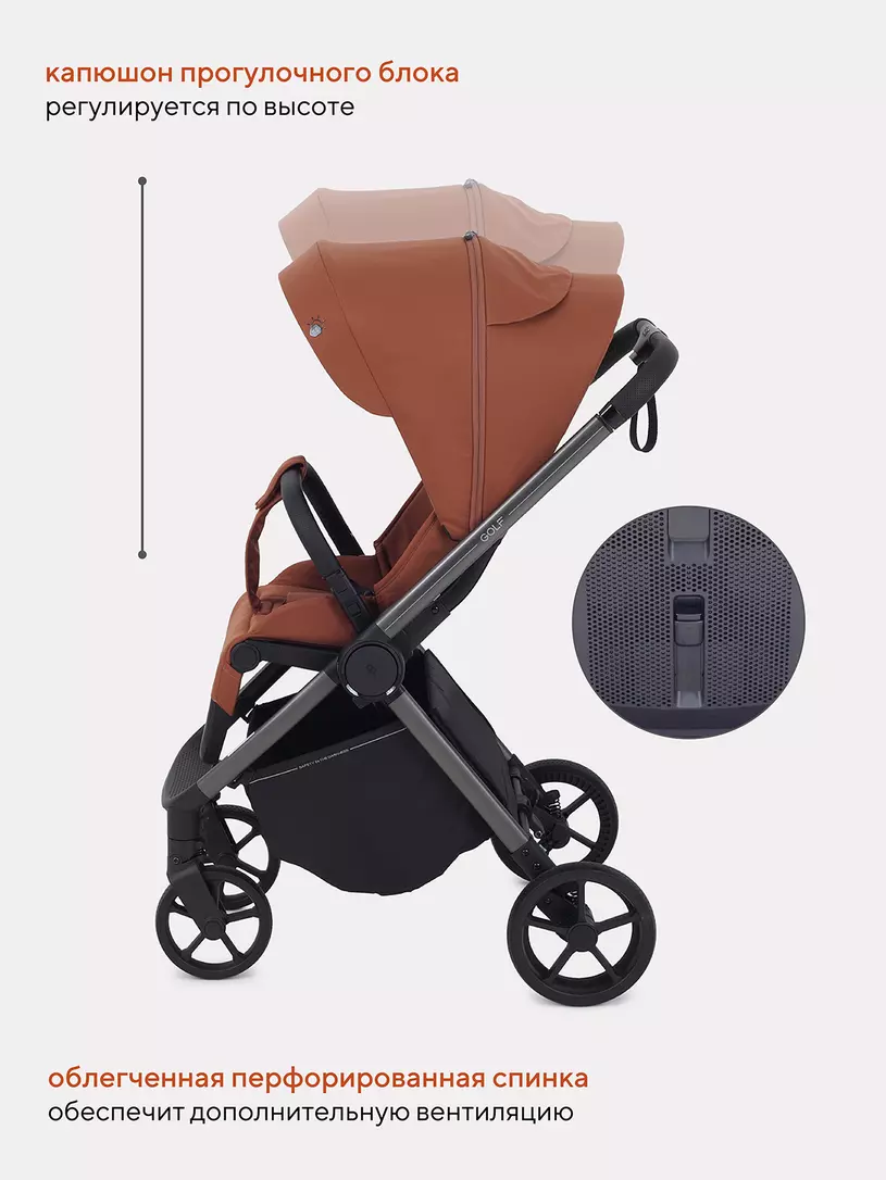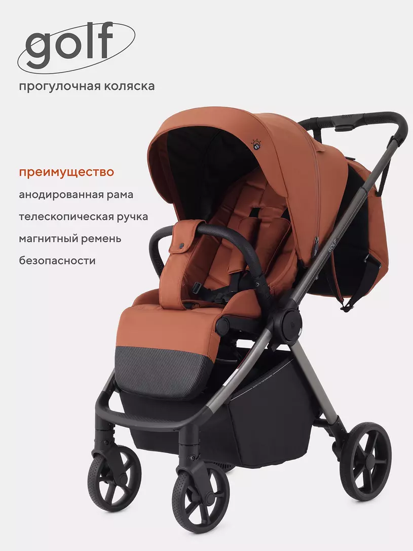 RANT GOLF будет удивлять вас снова и снова! Новые фишки детской прогулочной коляски: абсолютная инновация - магнитный замок на ремне безопасности, перфорированная спинка, регулировка капюшона по высоте, противокоррозионная рама, богатая комплектация.