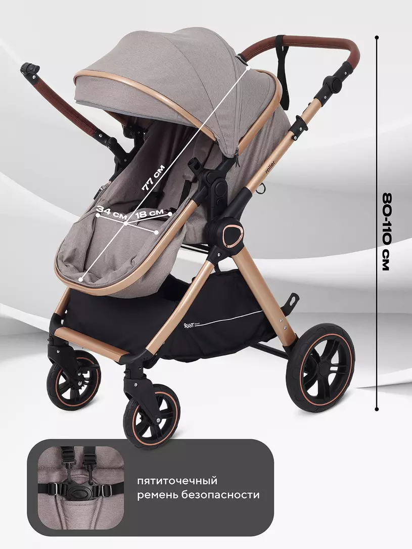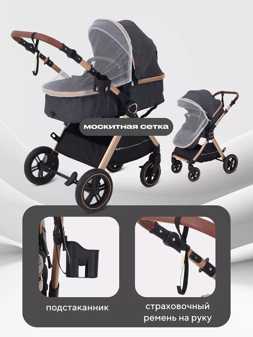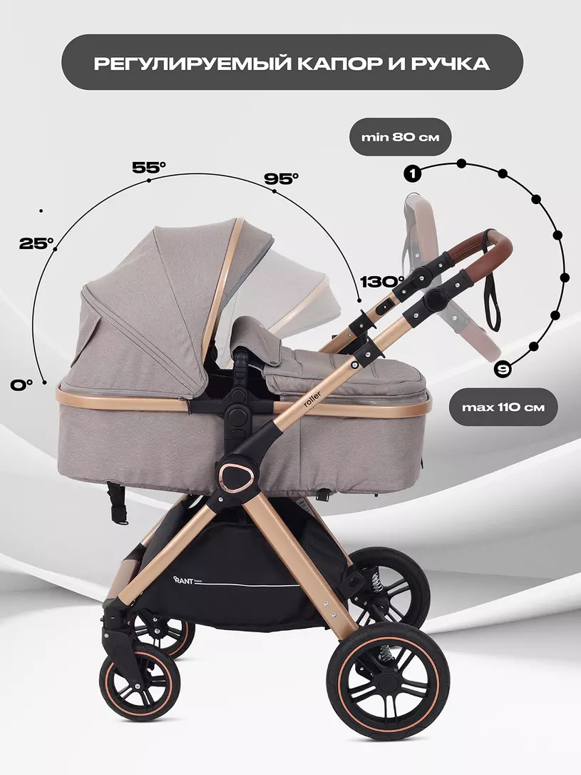 Детская коляска-трансформер RANT BASIC ROLLER GOLD 2024 - эргономичная и легкая! Особенности модели: трансформация в два движения; перекидная и регулируемая по высоте ручка; реверсивный блок; подстаканник для любимых напитков; тормоз-"качелька", не пачкающий обувь; эффектный внешний вид.