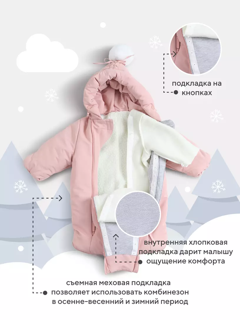 - съемная меховая подкладка позволяет использовать комбинезон как в осенне-весенний, так и в зимний период