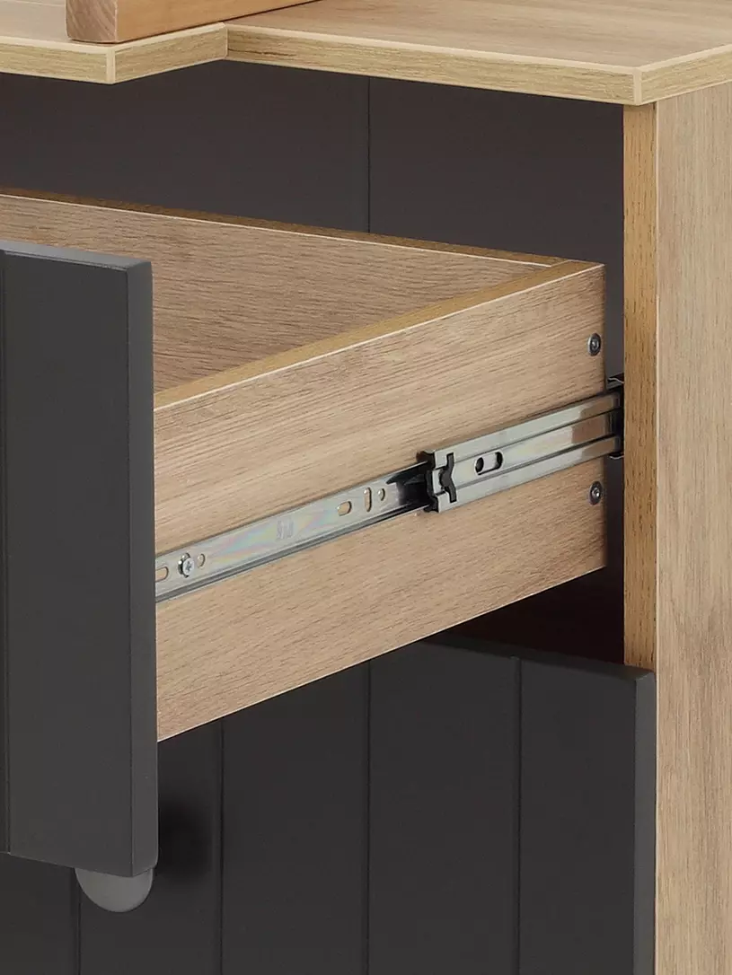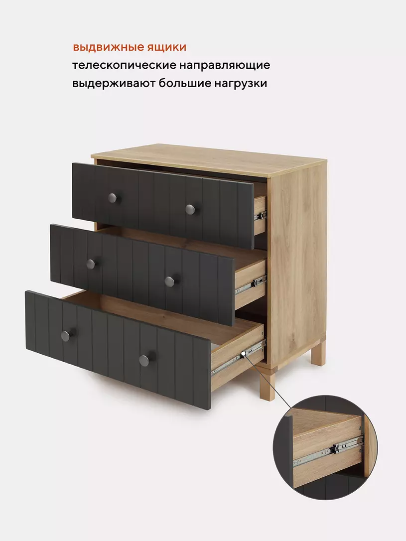- К тому же ящики дополнены специальными телескопическими направляющими, благодаря которым комод способен выдерживать большие нагрузки на протяжении длительного времени