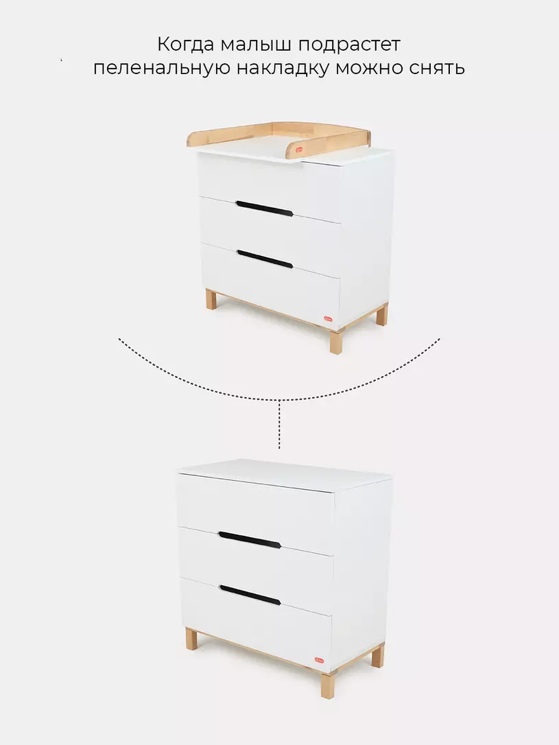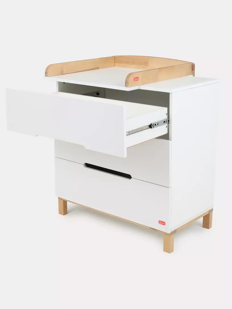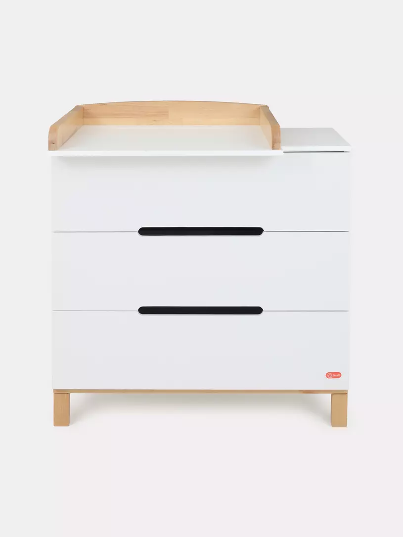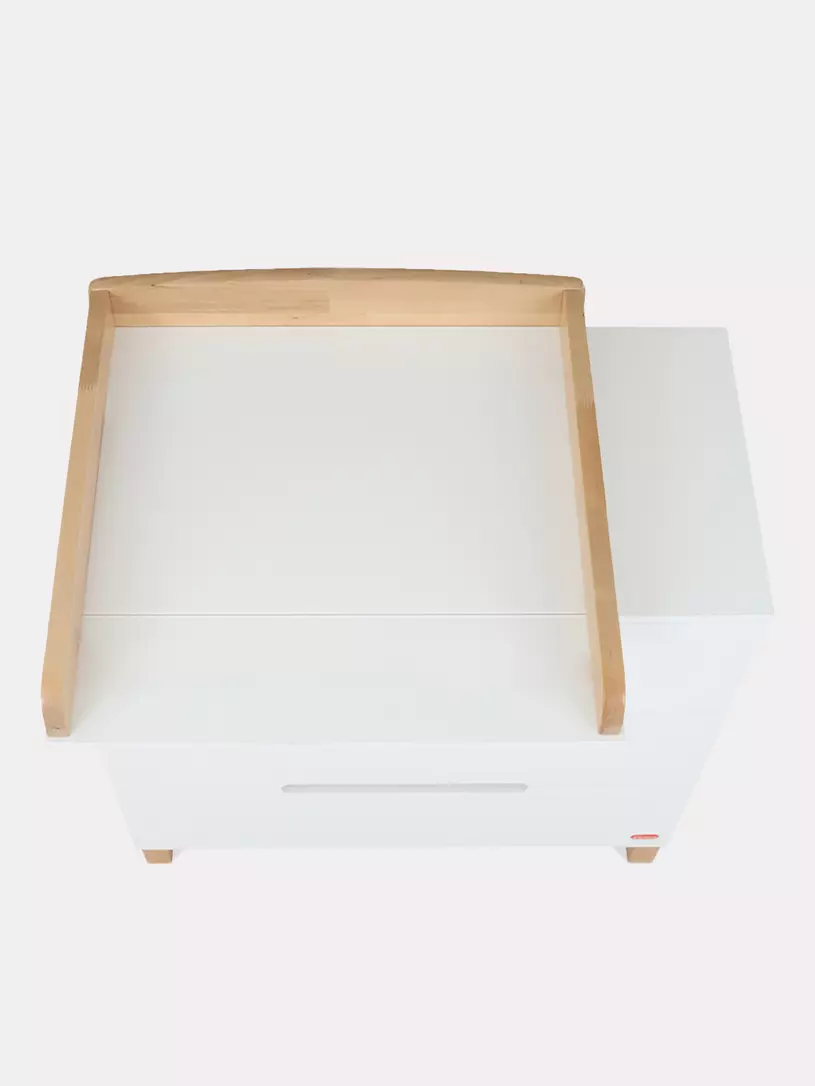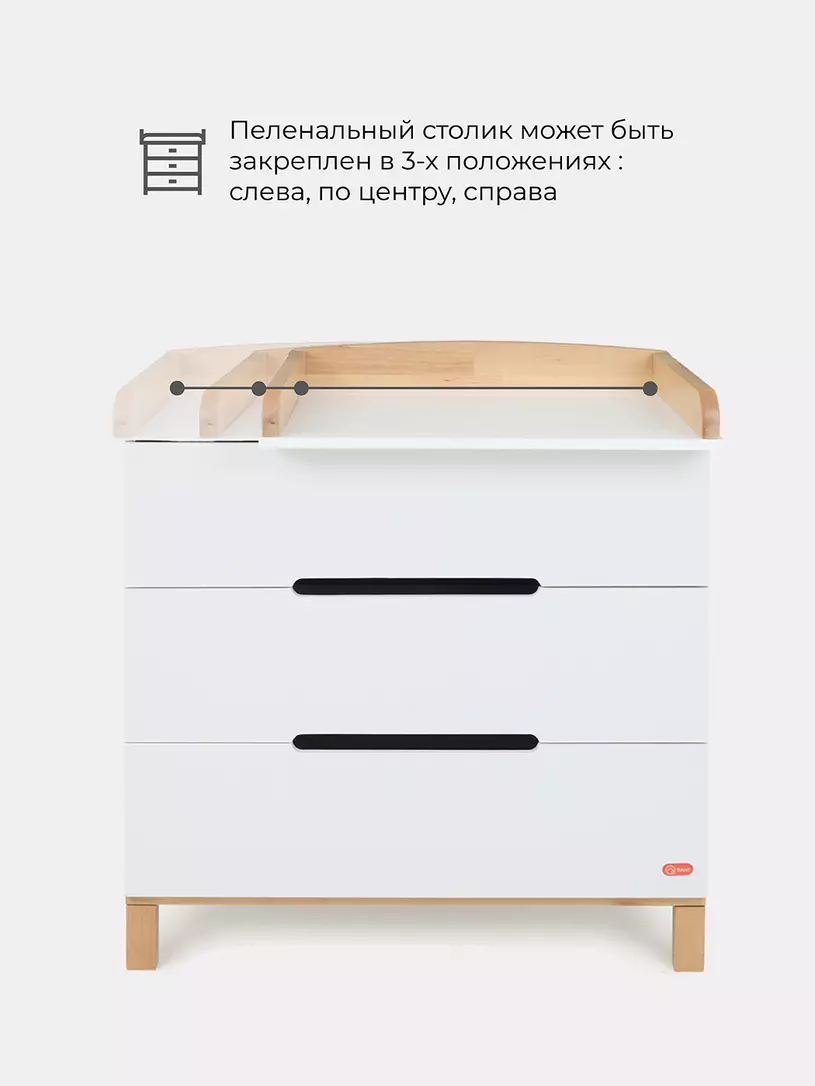 - конечно же, комодик имеет бортик, превращающий его в полноценный пеленальный столик. Более того, можно менять положение пеленального бортика, устанавливая его посередине поверхности комода, правее или левее.