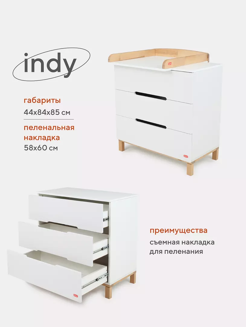 Пеленальный комод Indy, выдержанный в трендовом стиле экоминимализм, ненавязчиво расскажет о вашем тонком вкусе. Роскошная модель дополнена съемной накладкой для пеленания, усиленными телескопическими направляющими, стильными выпилами вместо накладных ручек.