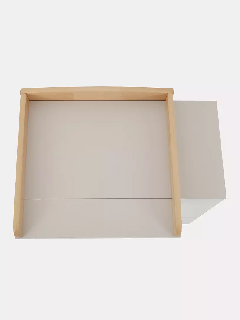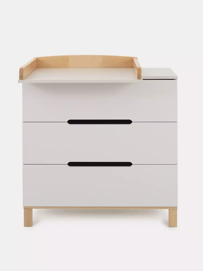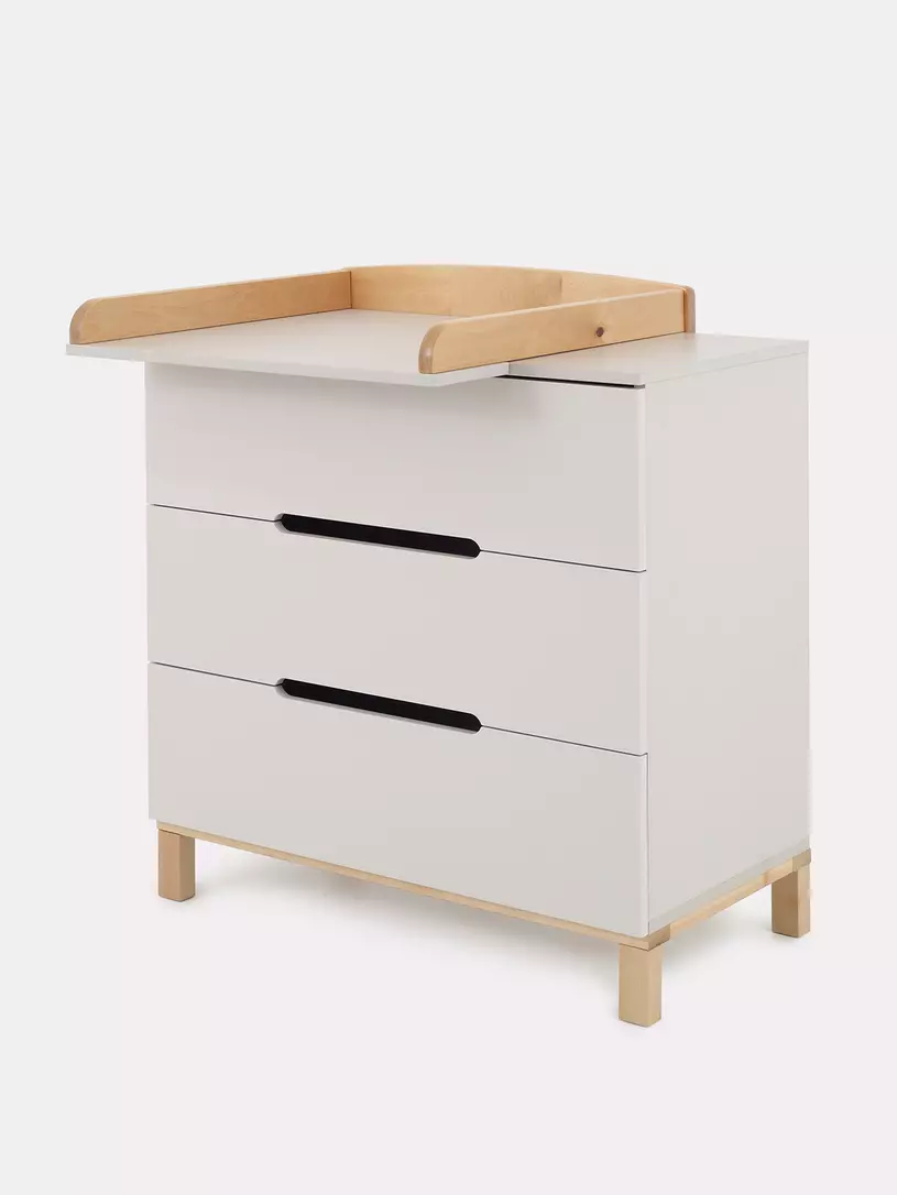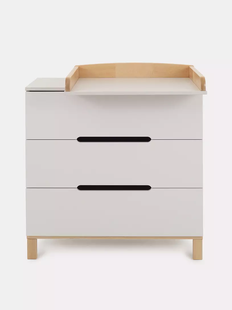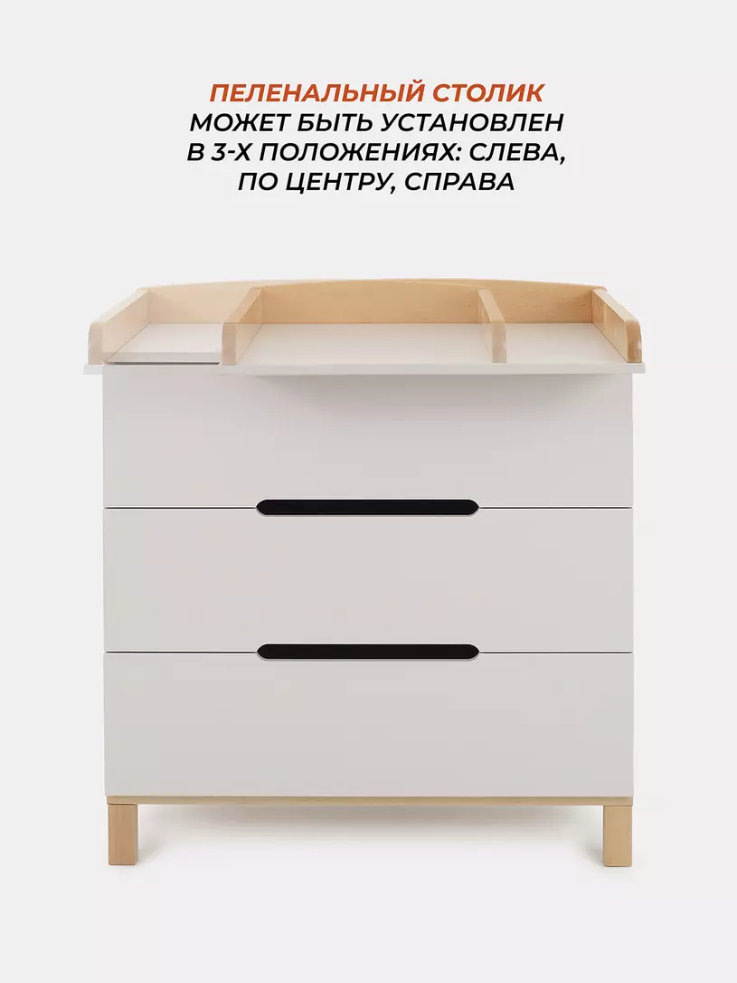 - конечно же, комодик имеет бортик, превращающий его в полноценный пеленальный столик. Более того, можно менять положение пеленального бортика, устанавливая его посередине поверхности комода, правее или левее.