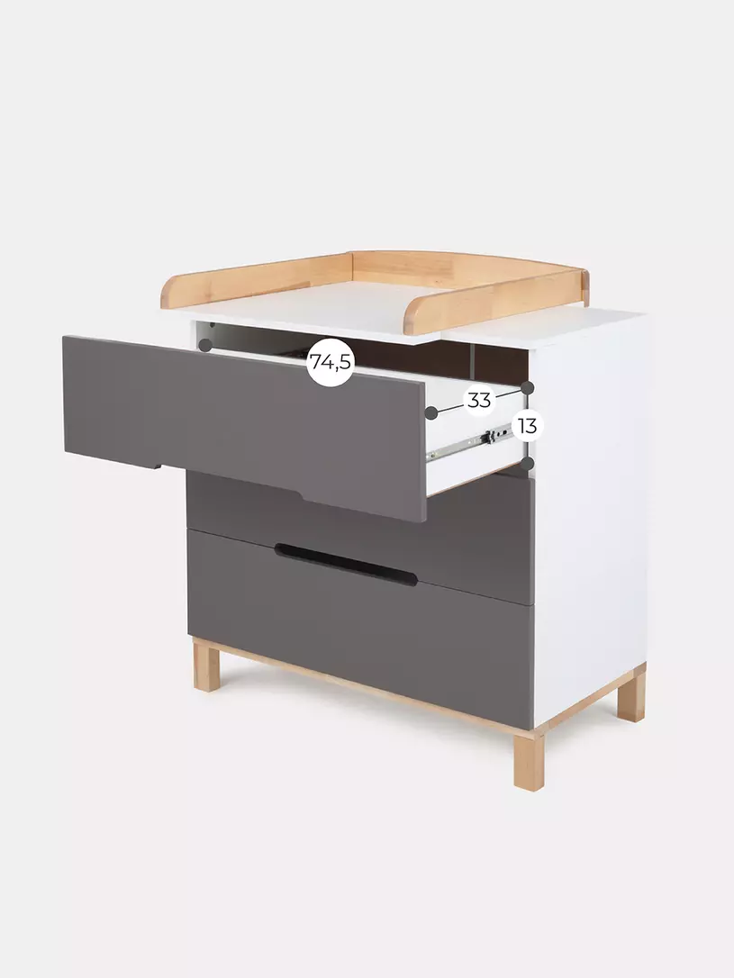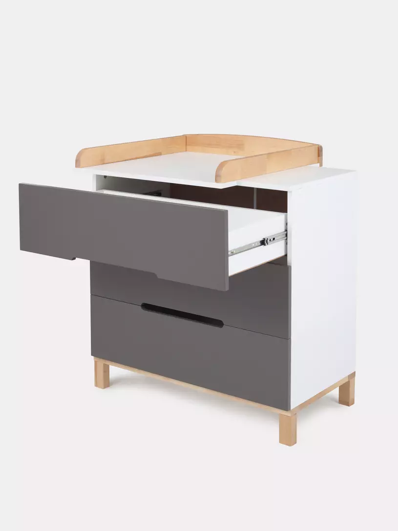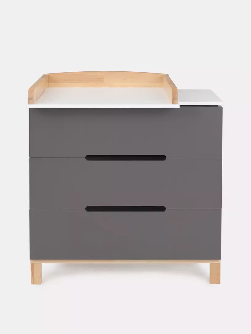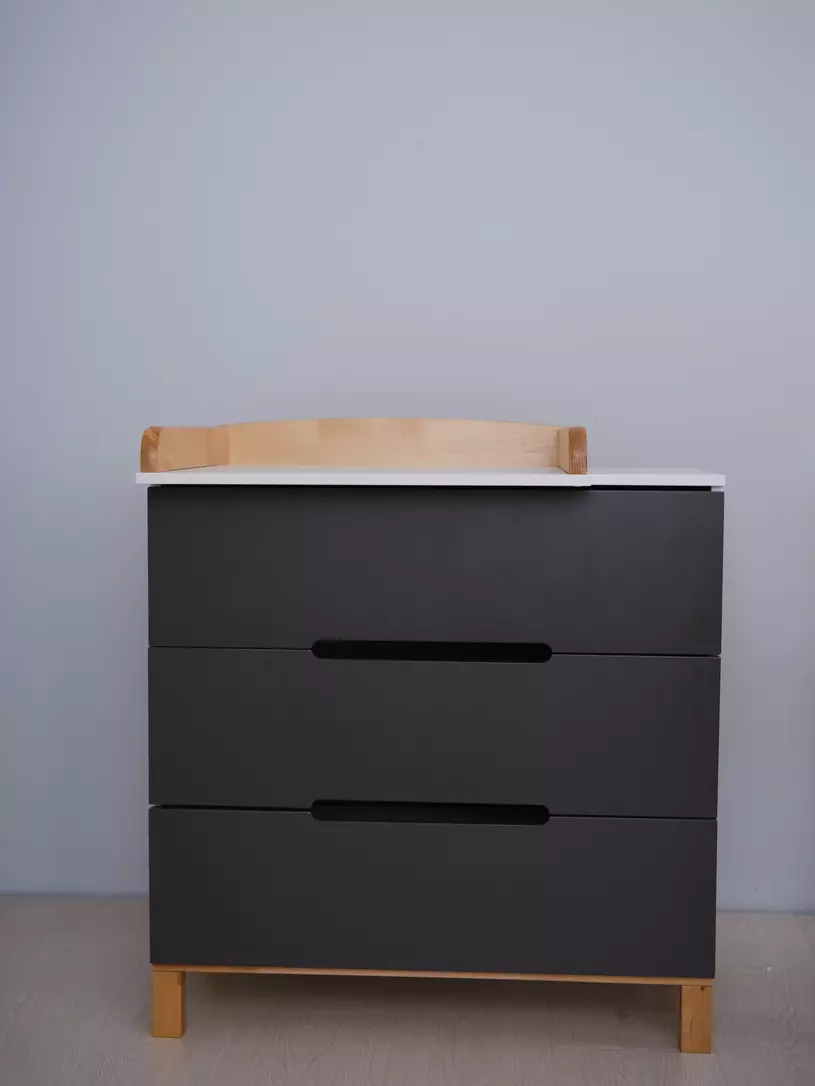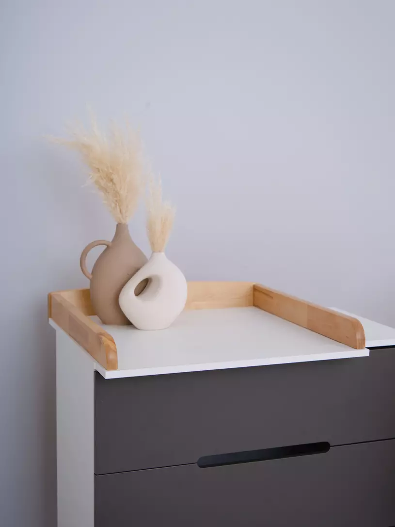 - конечно же, комодик имеет бортик, превращающий его в полноценный пеленальный столик. Более того, можно менять положение пеленального бортика, устанавливая его посередине поверхности комода, правее или левее.