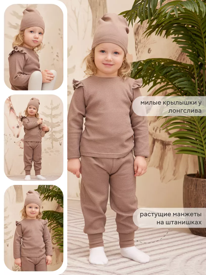 Трогательный комплект для прогулок, путешествий и запоминающихся фотосессий. Штанишки дополнены мягким поясом и широкими трикотажными манжетами. Застежка-поло на 3 пуговицы сделает процесс переодевания лонгслива максимально комфортным, а для маленьких модниц предлагается модель с очаровательными крылышками. В подарок стильная шапочка. Аксессуар не только отлично защитит ушки от ветра, но и завершит модный аутфит.