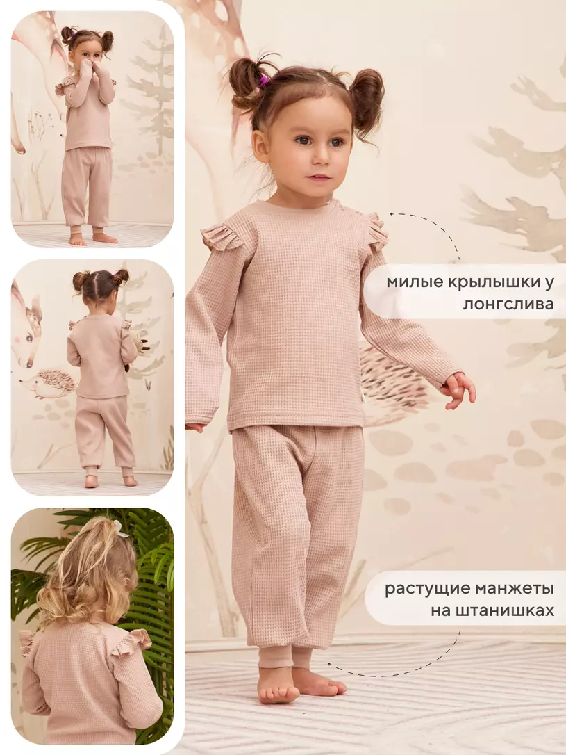 Трогательный комплект для прогулок, путешествий и запоминающихся фотосессий. Штанишки дополнены мягким поясом и широкими трикотажными манжетами. Застежка-поло на 3 пуговицы сделает процесс переодевания лонгслива максимально комфортным, а для маленьких модниц предлагается модель с очаровательными крылышками. В подарок стильная шапочка. Аксессуар не только отлично защитит ушки от ветра, но и завершит модный аутфит.