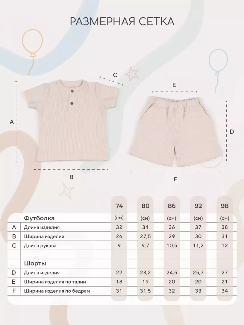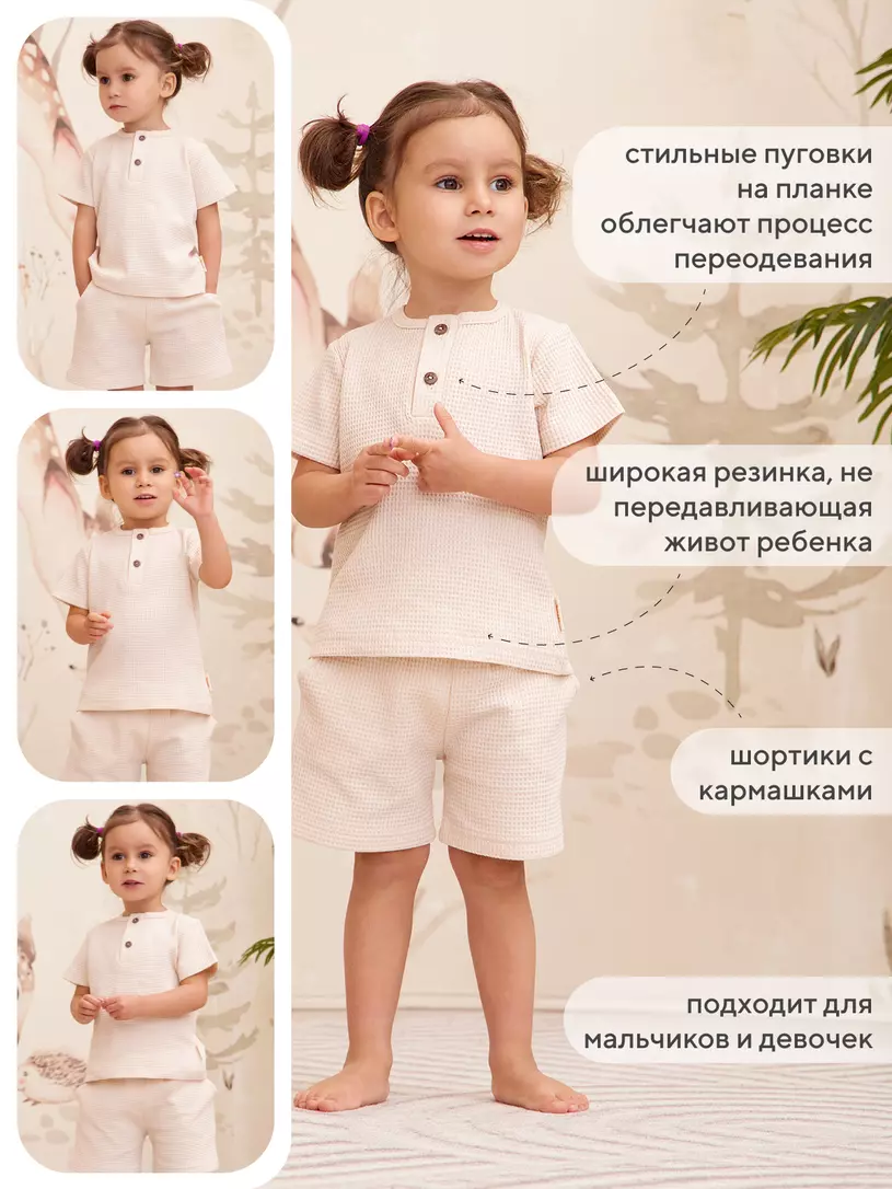 Трогательный комплект для прогулок, путешествий и запоминающихся фотосессий. Шорты дополнены мягким поясом и карманами для важных находок во время прогулки. Застежка-поло на 2 пуговицы сделает процесс переодевания футболки максимально комфортным.
