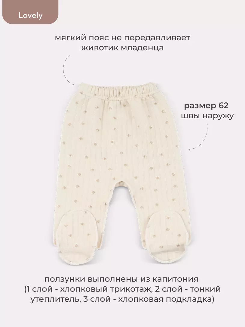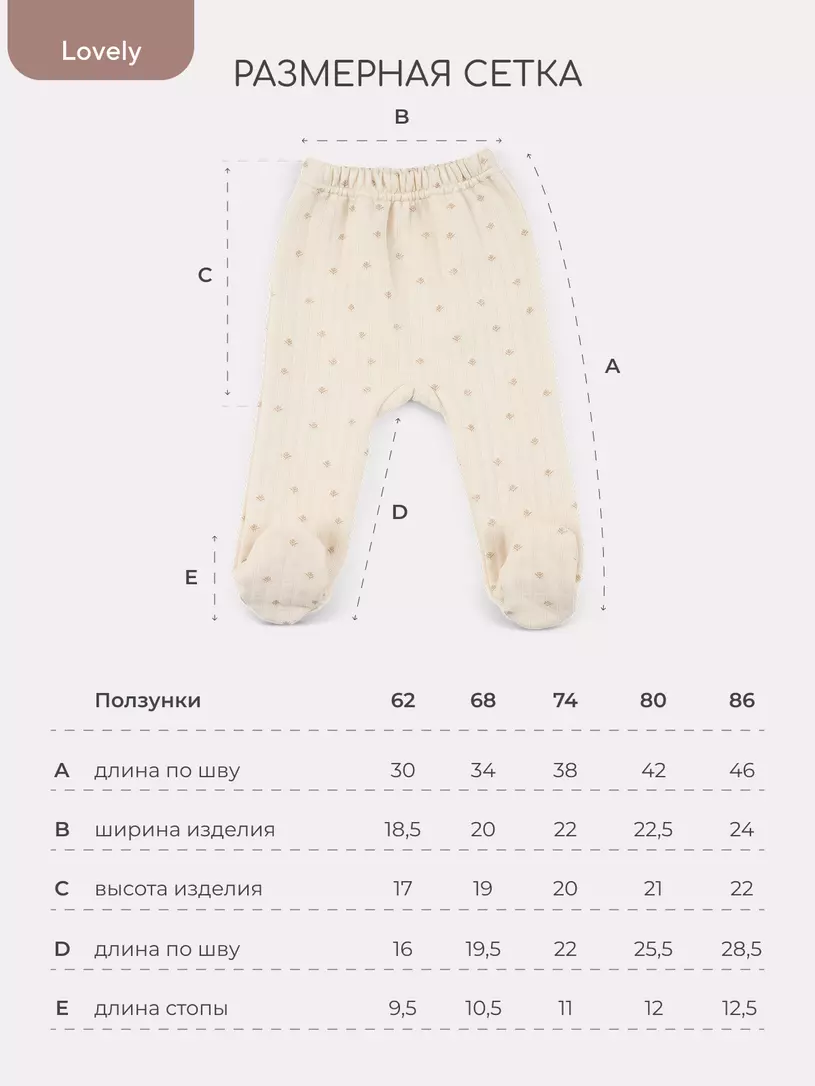 Обращаем ваше внимание: размер 62 идет швами наружу; размеры 62, 68 выполнены с закрытой ножкой.