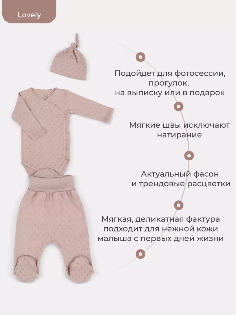 Коллекция LOVELY подарит крохе ощущение нежности и особой заботы. Мягкие сдержанные расцветки (молоко, какао, топленое масло), деликатные натуральные ткани премиум-класса (перфорированный трикотаж и утепленный капитоний), качественная фурнитура в тон, комфортное лекало, лаконичное исполнение, сочетающиеся между собой изделия - визитная карточка нашей одежды для новорожденных и малышей постарше.