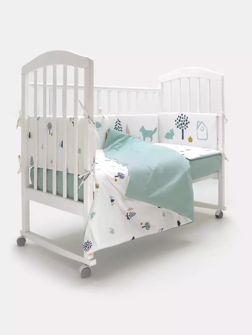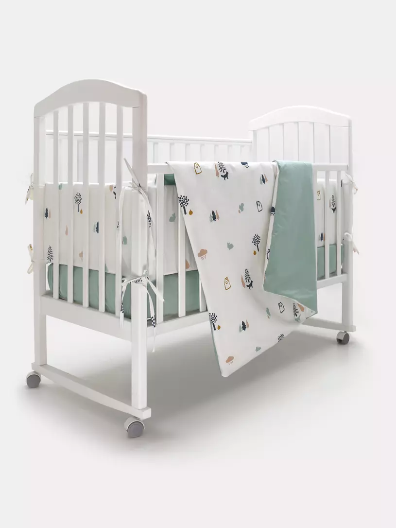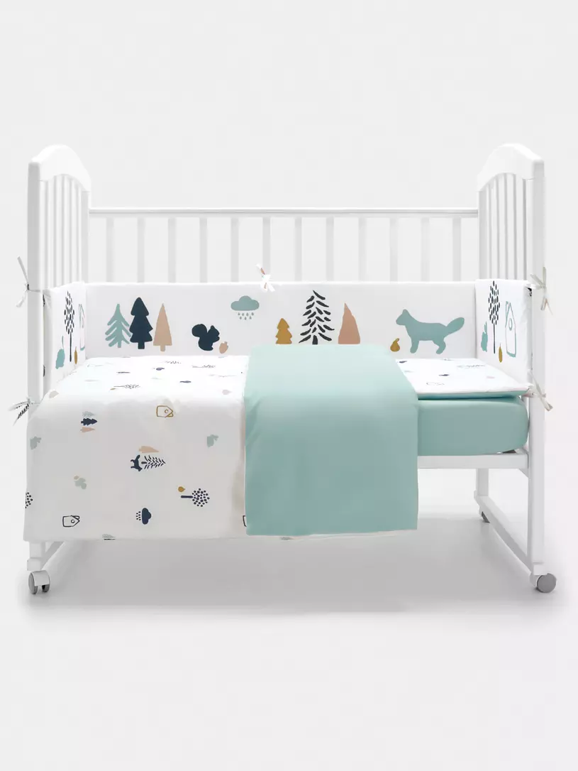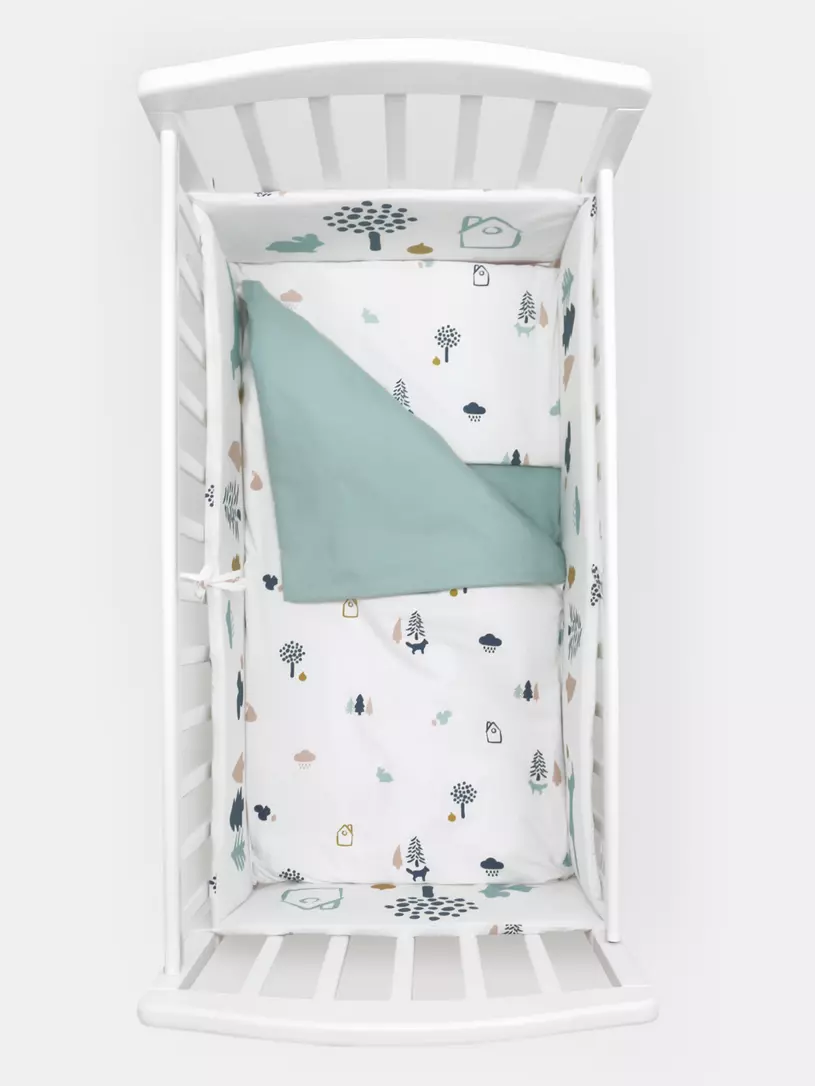 - удивительные деревья, животные, тучки и домики удобно расположились на всех бортиках, пододеяльнике и наволочке. Простыня и тыльные стороны пододеяльника и наволочки выполнены в монохромном цвете, идеально сочетающимся с принтом.