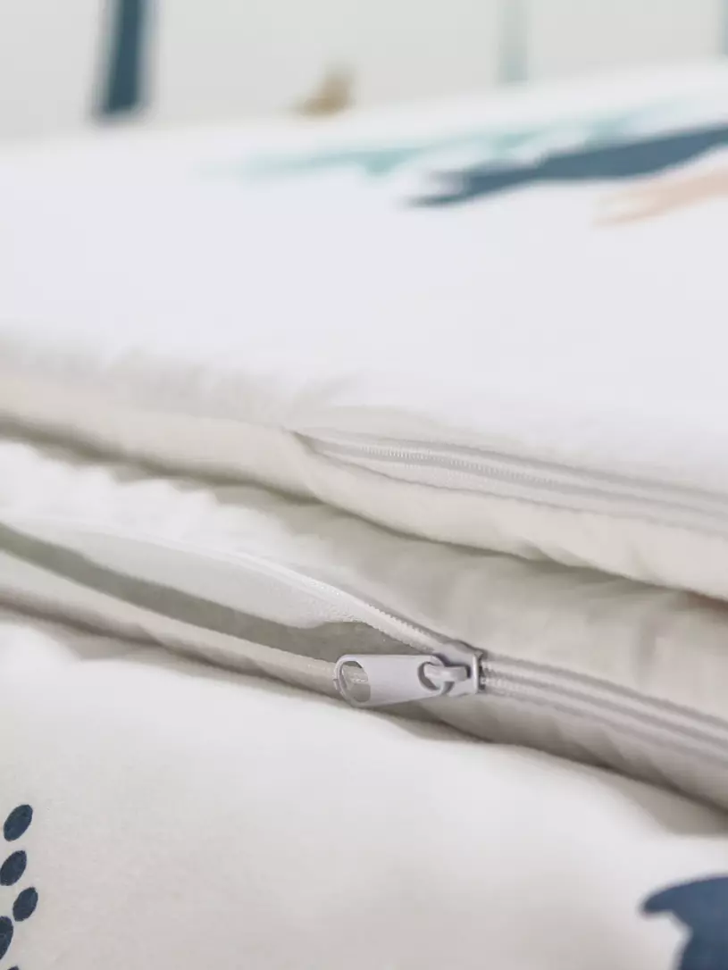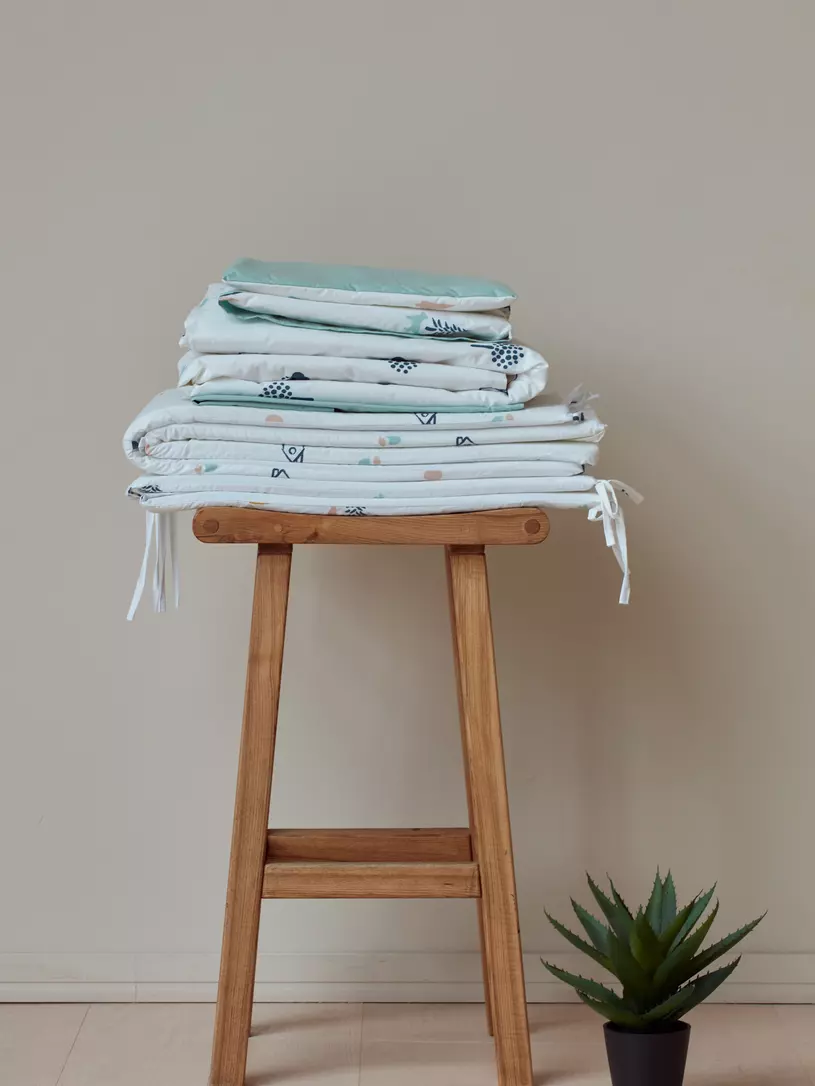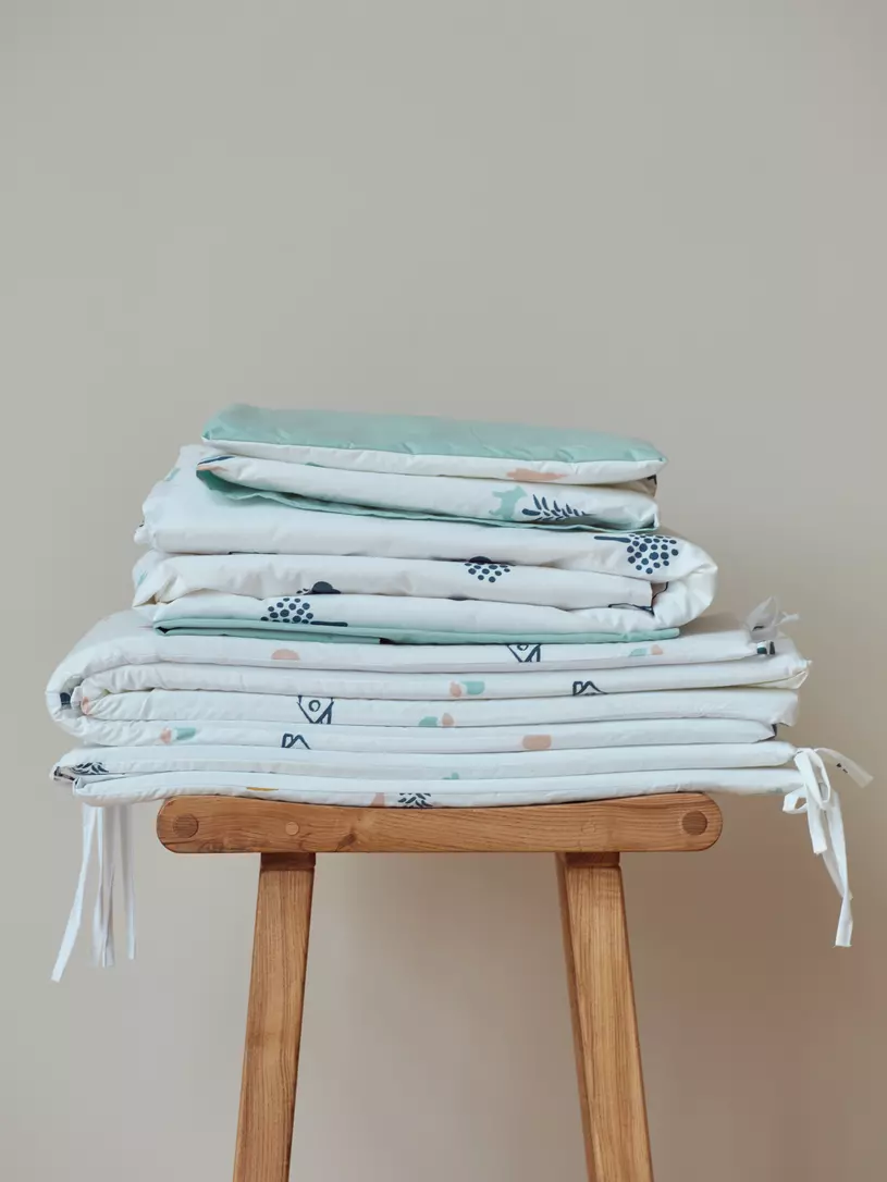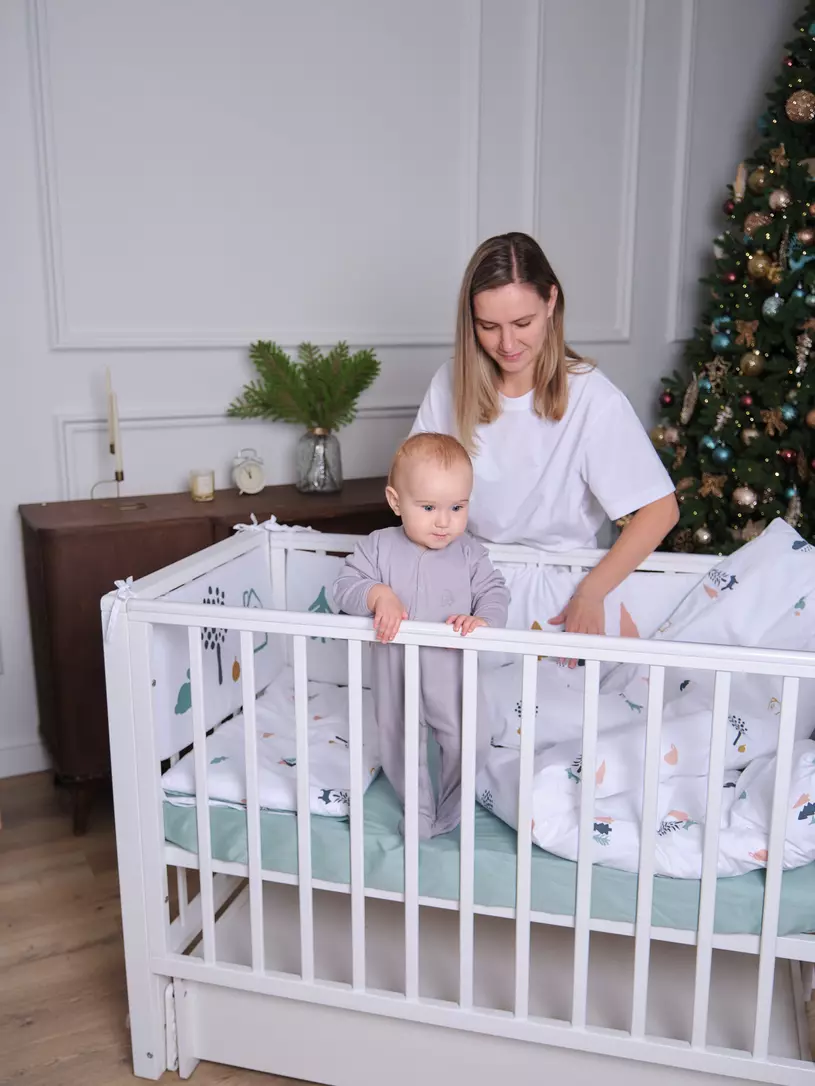 - удивительные деревья, животные, тучки и домики удобно расположились на всех бортиках, пододеяльнике и наволочке. Простыня и тыльные стороны пододеяльника и наволочки выполнены в монохромном цвете, идеально сочетающимся с принтом.