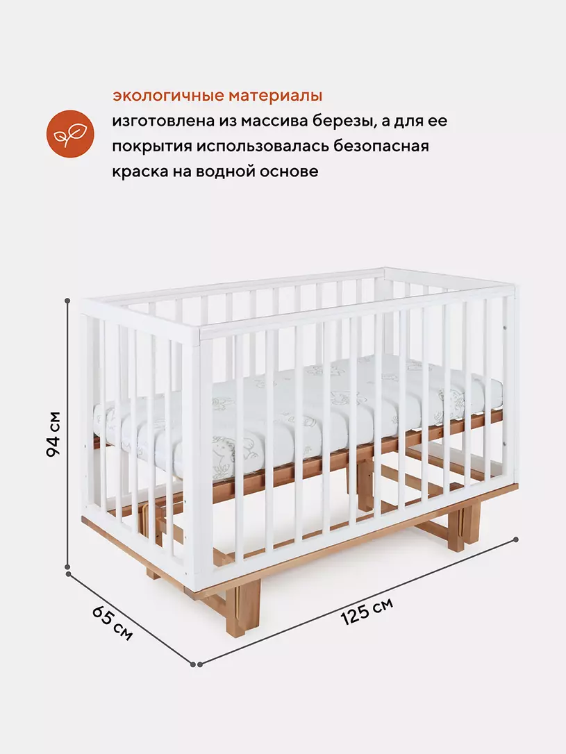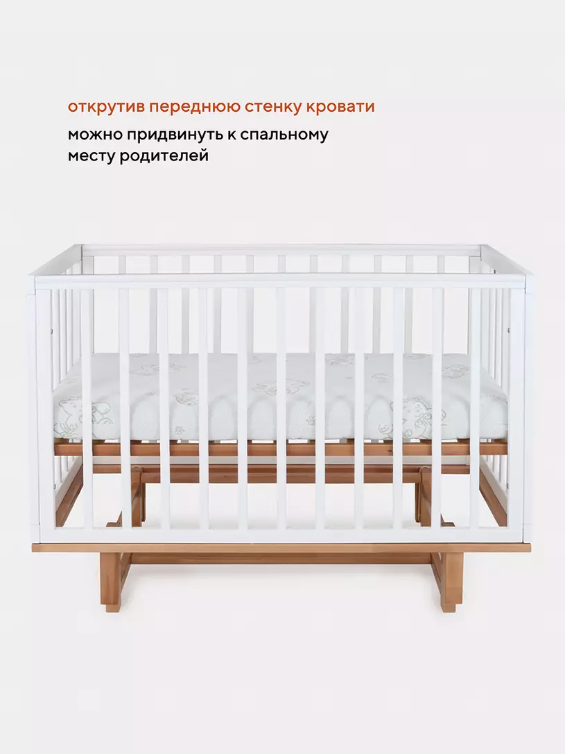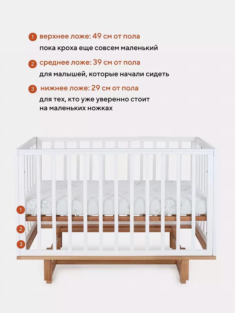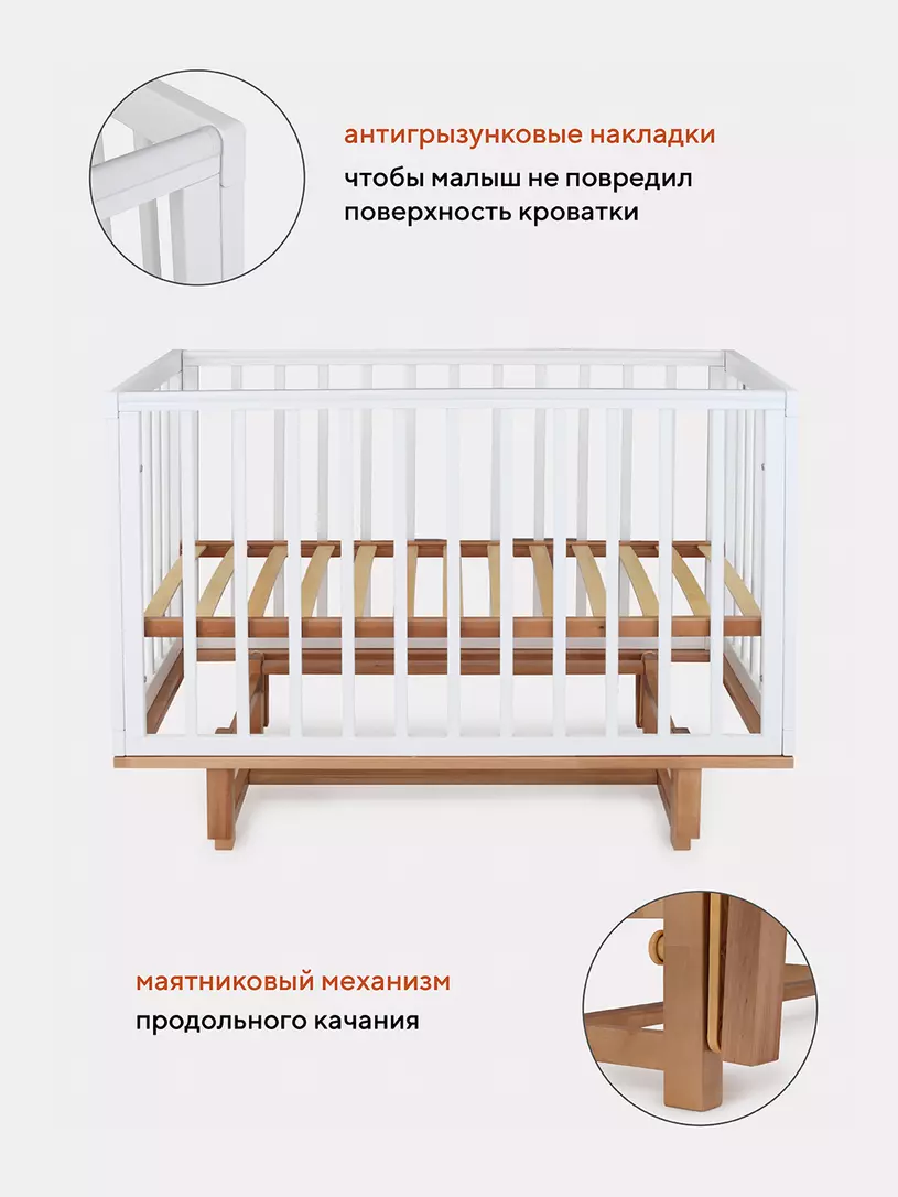 - боковые стенки дополнены антигрызунковыми силиконовыми накладками - малыш не повредит десна во время прорезывания первых зубов, да и кроватка останется в первозданном виде