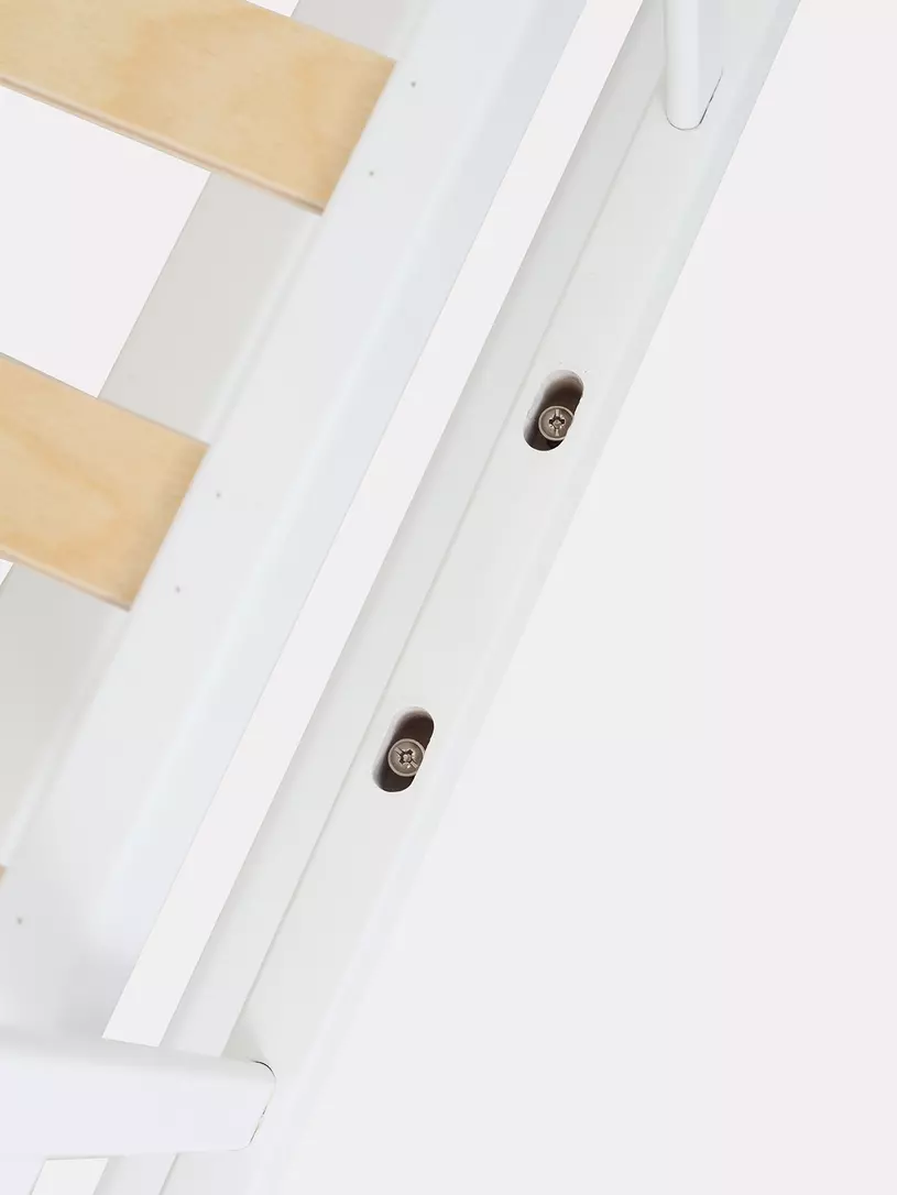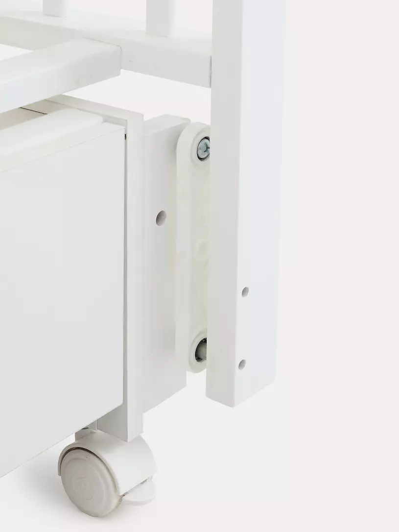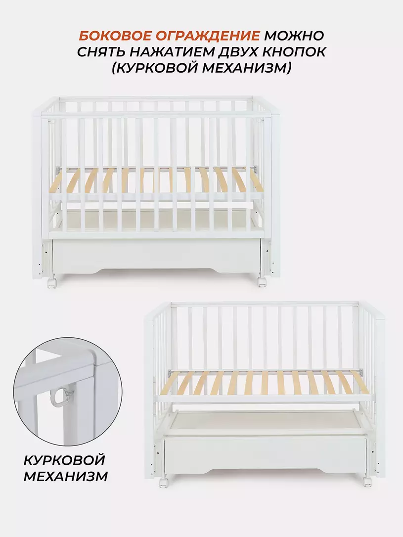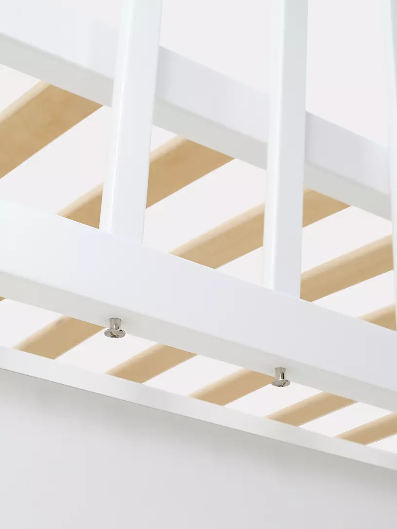 - съемную боковую стенку удобно опускать нажатием двух кнопок (курковый механизм). Также ее вовсе можно снять и, например, придвинуть к кровати родителей, чтобы обеспечить спокойный сон маме и малышу. Когда кроха вырастет, боковая стенка снимается - кровать превращается в уютный диванчик.