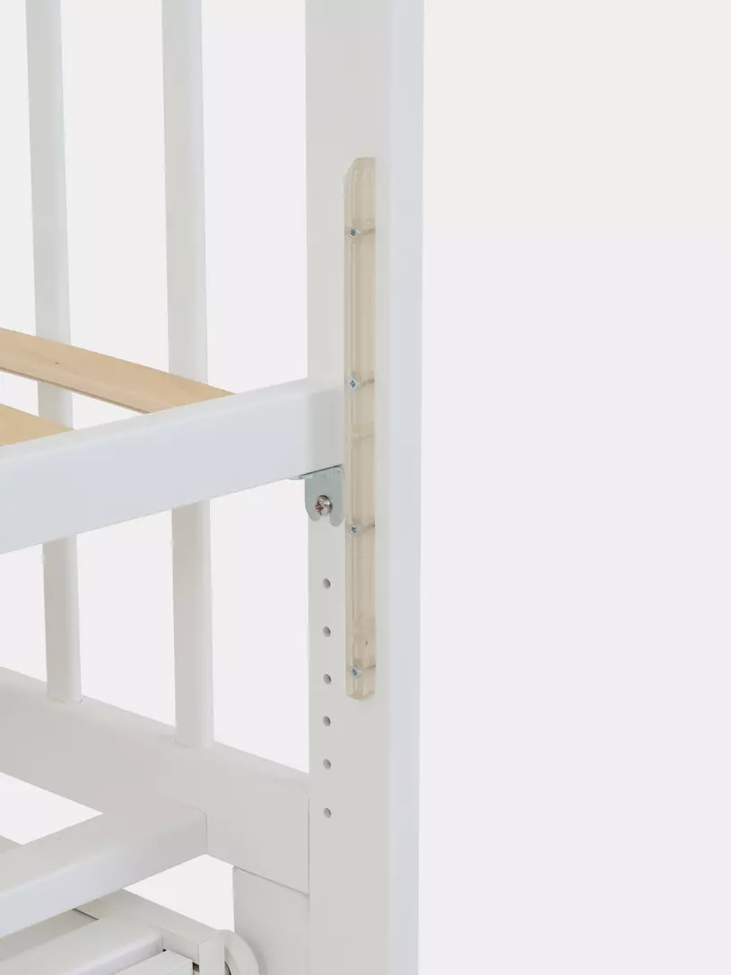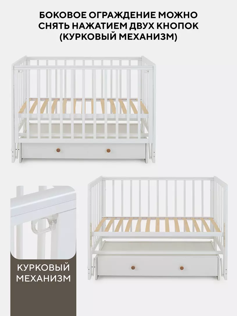 - съемную боковую стенку удобно опускать нажатием двух кнопок (курковый механизм). Также ее вовсе можно снять и, например, придвинуть к кровати родителей, чтобы обеспечить спокойный сон маме и малышу. Когда кроха вырастет, боковая стенка снимается - кровать превращается в уютный диванчик.