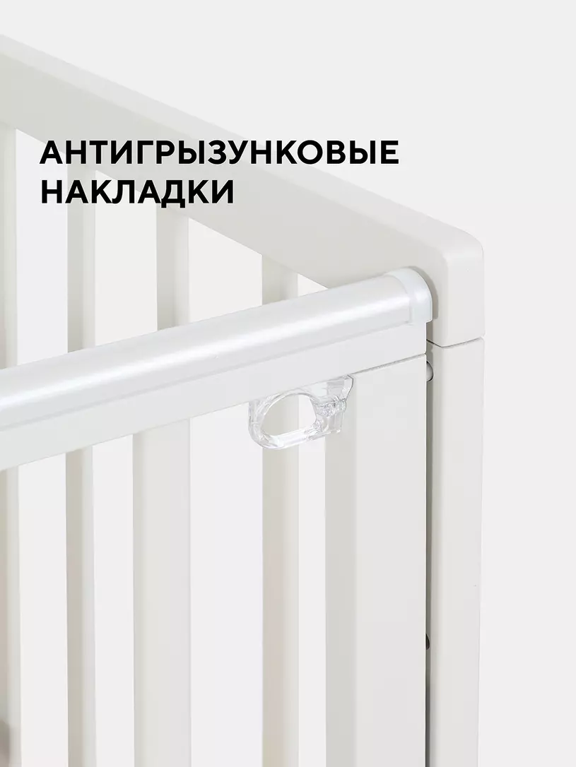 - верхние планки боковых стенок дополнены силиконовыми накладками, чтобы малыш не повредил десна (во время прорезывания зубов) и поверхность кроватки