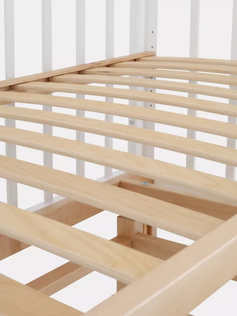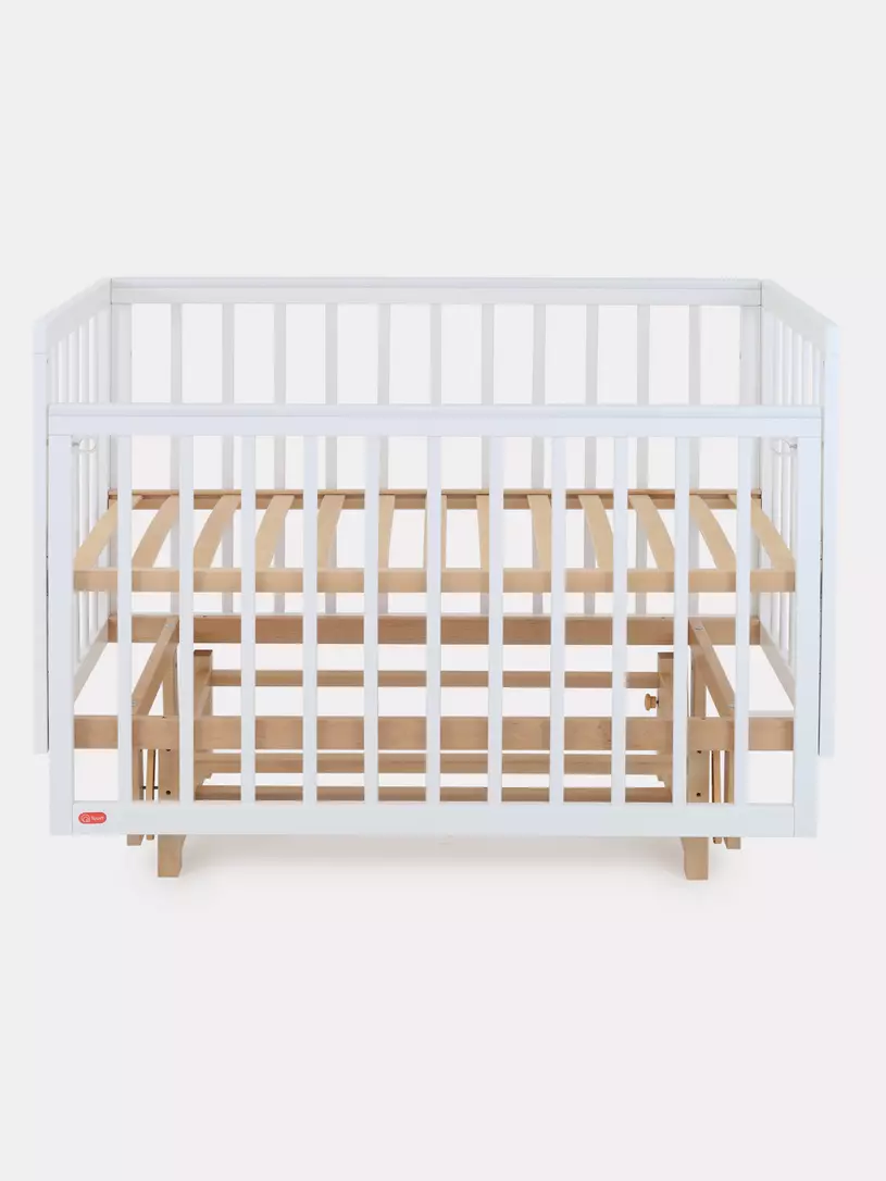 - чтобы обеспечить спокойный сон маме и малышу, боковое ограждение можно легко снять нажатием двух кнопок (курковый механизм) и придвинуть кроватку к кровати родителей, а когда кроха подрастет кроватка превращается в уютный диванчик