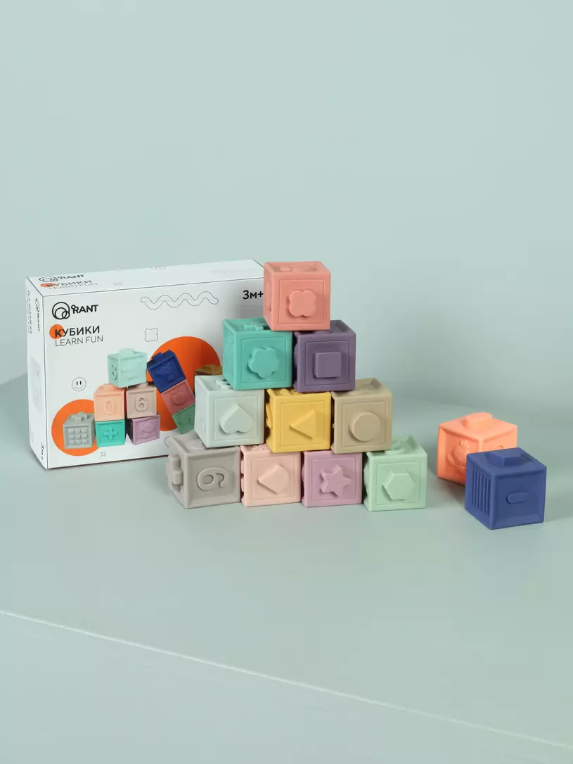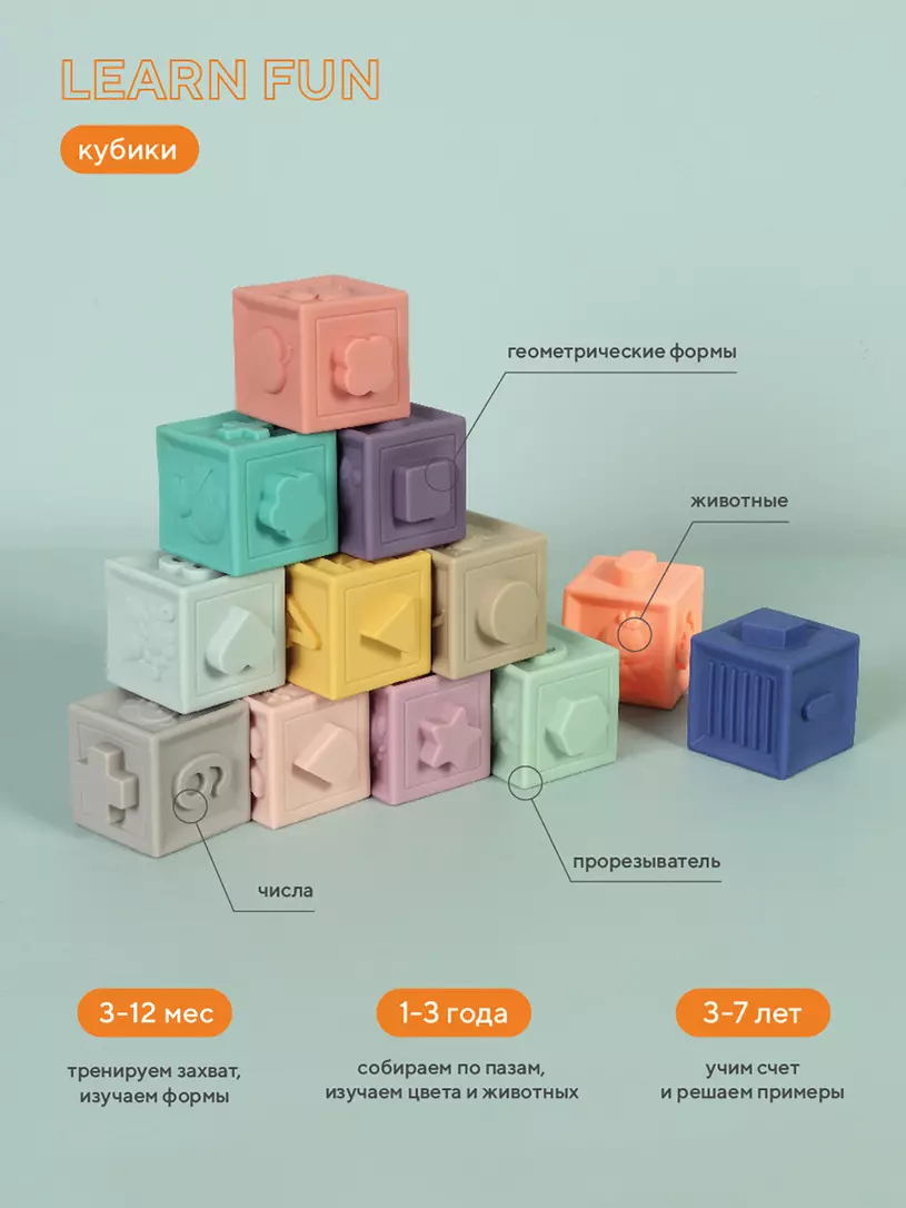 Кубики RANT LEARN FUN, выполненные из пищевого силикона, пригодятся малышам от 3 месяцев до 7 лет: 3-12 месяцев прорезываем зубки, тренируем захват, изучаем геометрические формы; 1-3 года собираем башенки по пазам, знакомимся с цветом и животными; 3-7 лет учим счет и решаем первые простые примеры.