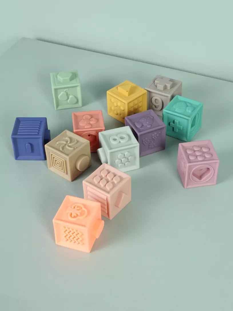 - Кубики прекрасно развивают: звуковое восприятие (при нажатии слышен мягкий звук), цветовое восприятие, мелкую моторику, логику и структурное мышление, координацию движений.