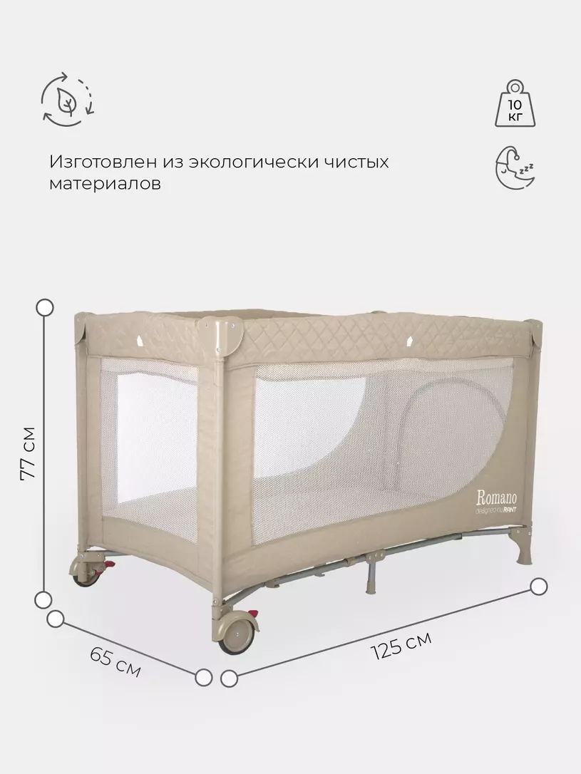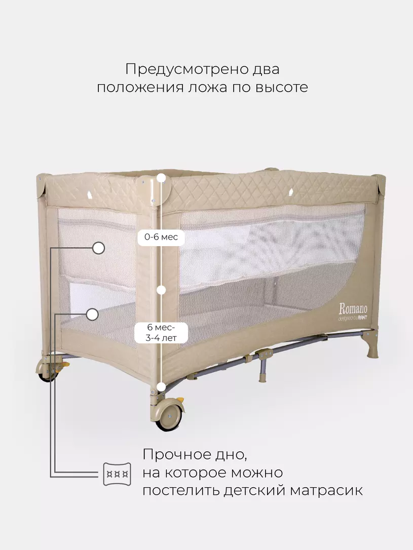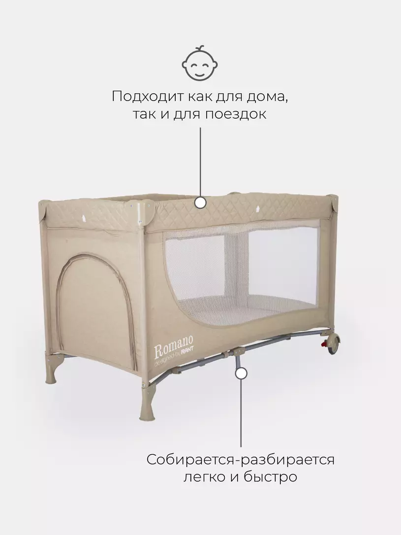 Продуманный детский манеж-кровать Rant Romano покорит вас: максимальной мобильностью, двумя положениями ложа по высоте, лазом на молнии для подросших малышей, компактностью в сложенном виде, удобной сумкой-чехлом.