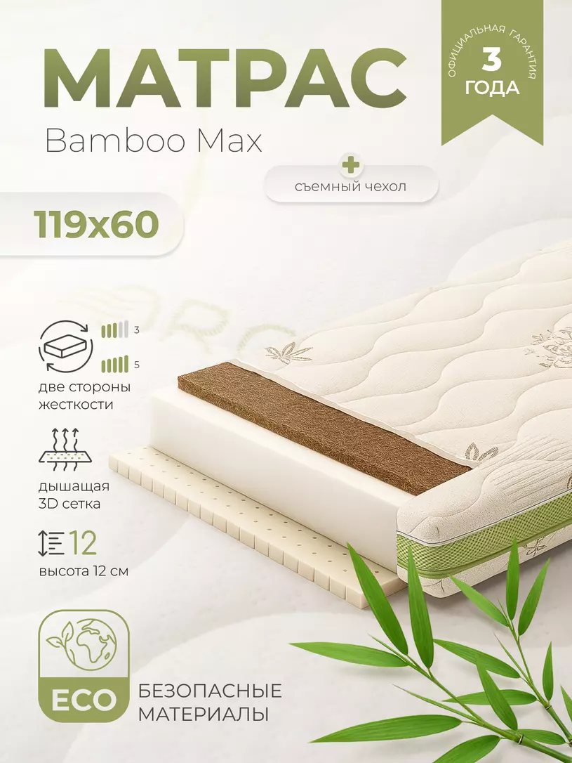 Сладкий сон и здоровый позвоночник вашему крохе подарит детский матрас RANT BAMBINO MAX. Аксессуар покорит вас: правильной толщиной (12 см); идеальным составом: латекс Artilat, инновационный Airoflex-Сotton, кокосовая койра 100%; переменной жесткостью; антидеформационными и ортопедическими свойствами; системой вентиляции; уникальной тканью чехла.