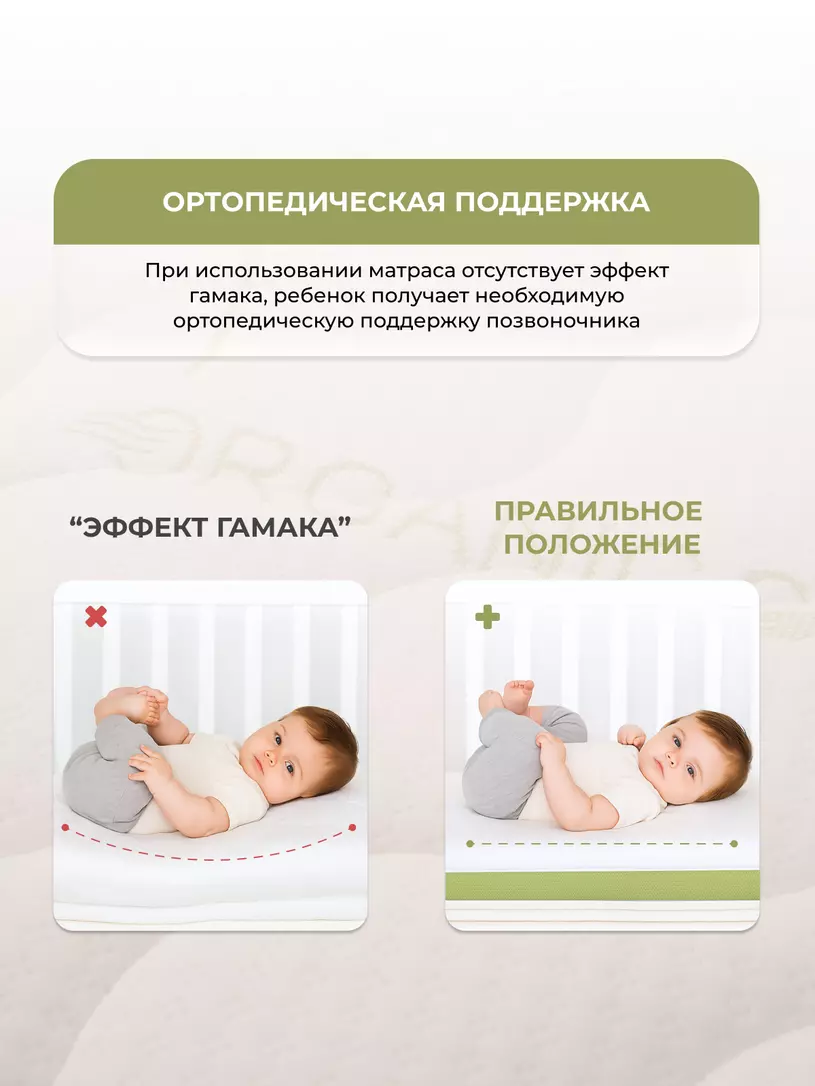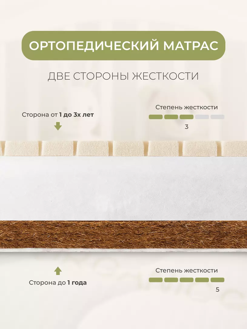 - ортопедический матрас имеет 2 стороны жесткости: сторона с кокосовой койрой - жесткая, на ней малышу рекомендуется спать от 0 до 1 года; сторона с латексом - средней жесткости, на ней рекомендуется спать малышу старше 1 года.