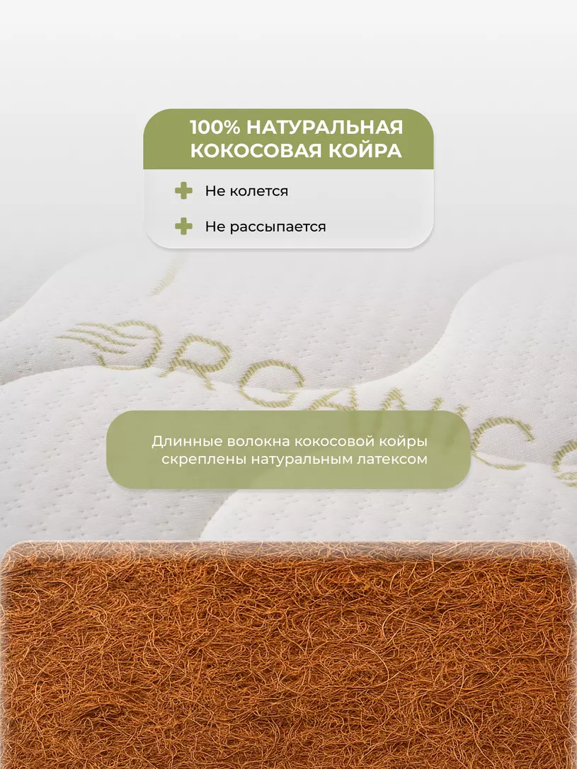 - 3 см - Кокосовая койра 100%. Именно на этом материале малышу необходимо спать с рождения и до 12 месяцев для правильного формирования позвоночника, так как кокосовая койра обладает необходимой жесткостью. К тому же подобный материал экологичен, отлично вентилируется и не накапливает неприятные запахи и пыль. Длинные волокна кокосовой койры скреплены натуральным латексом, чтобы этот слой матраса не кололся и не рассыпался.