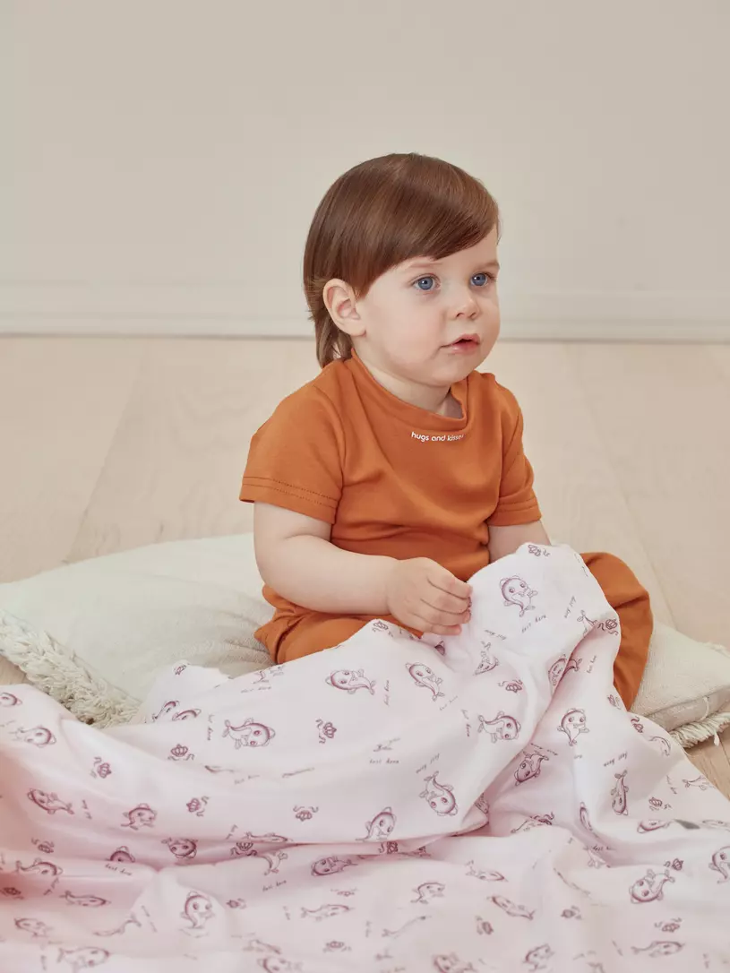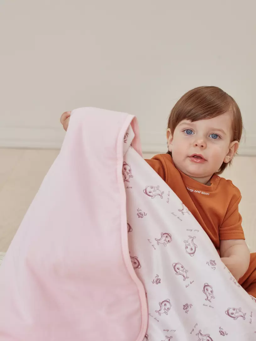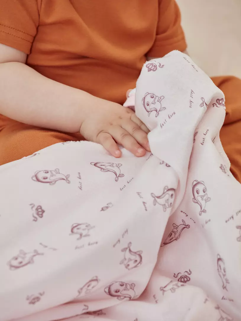 - выполнен плед из гипоаллергенных материалов, которые абсолютно безопасны для новорожденных: одна сторона - из интерлока (трикотажное 100% хлопковое полотно), другая сторона - из вельбоа (французский мех или плюш - очень мягкая материя с бархатистым “мехом” средней длины)