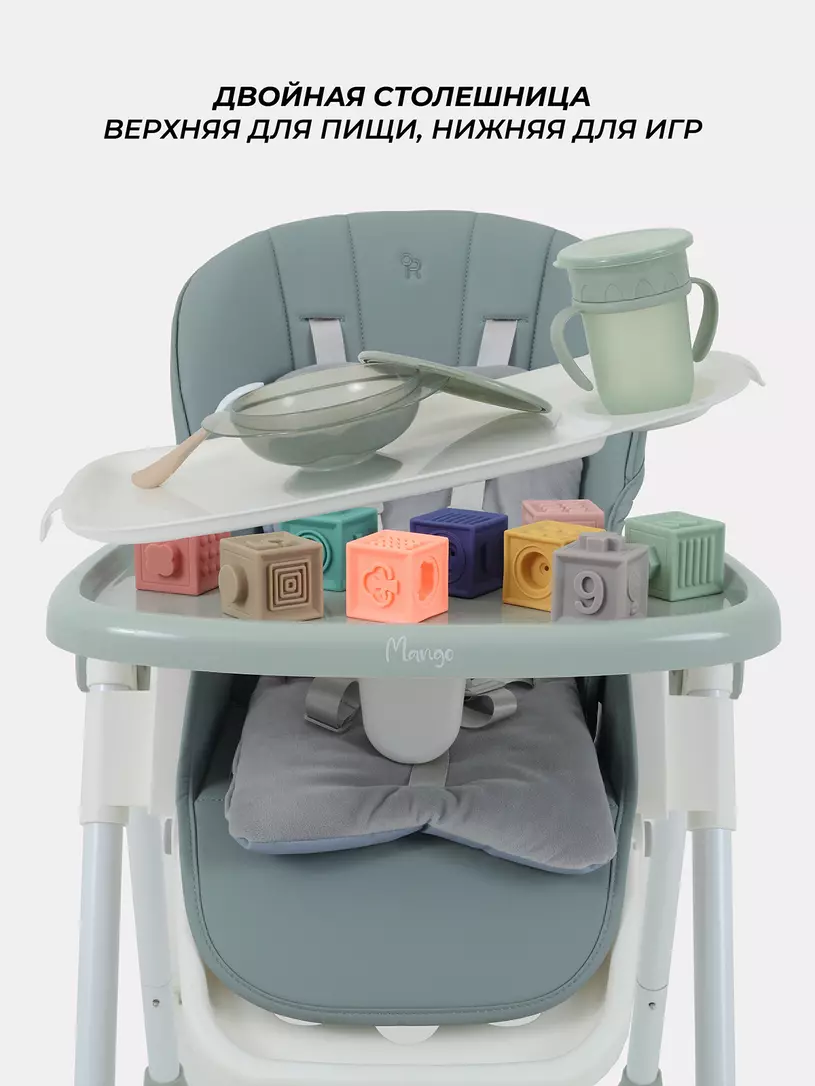 - двойная столешница. Для принятия пищи используется верхняя столешница. В ней имеется круглое отделение под поильник. Верхнюю столешницу очень удобно снимать сразу после еды, чтобы помыть или протереть. Нижняя столешница используется для игр, лепки, рисования.