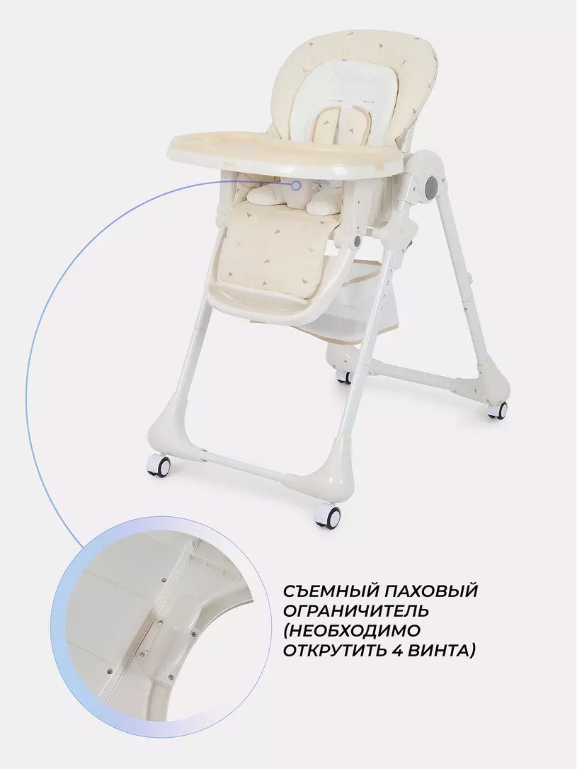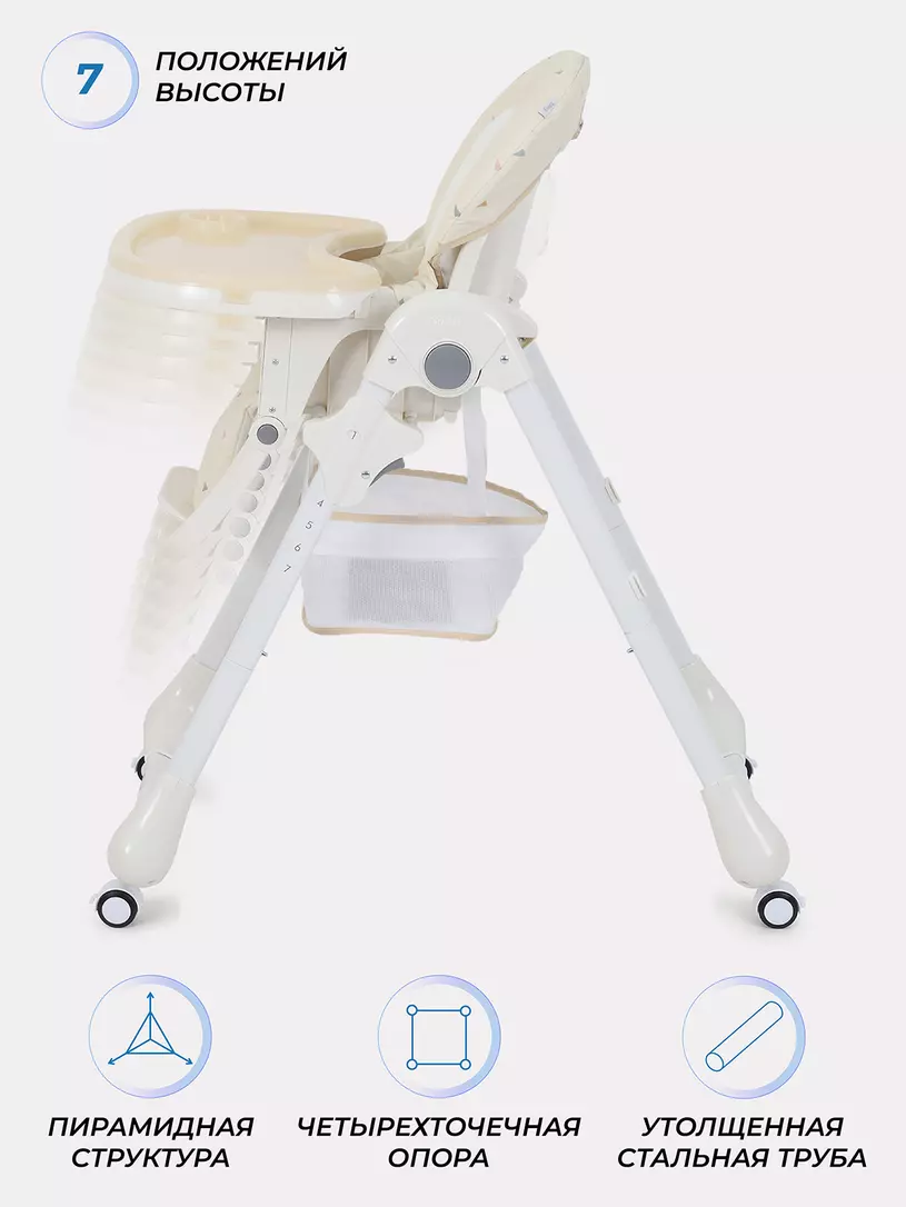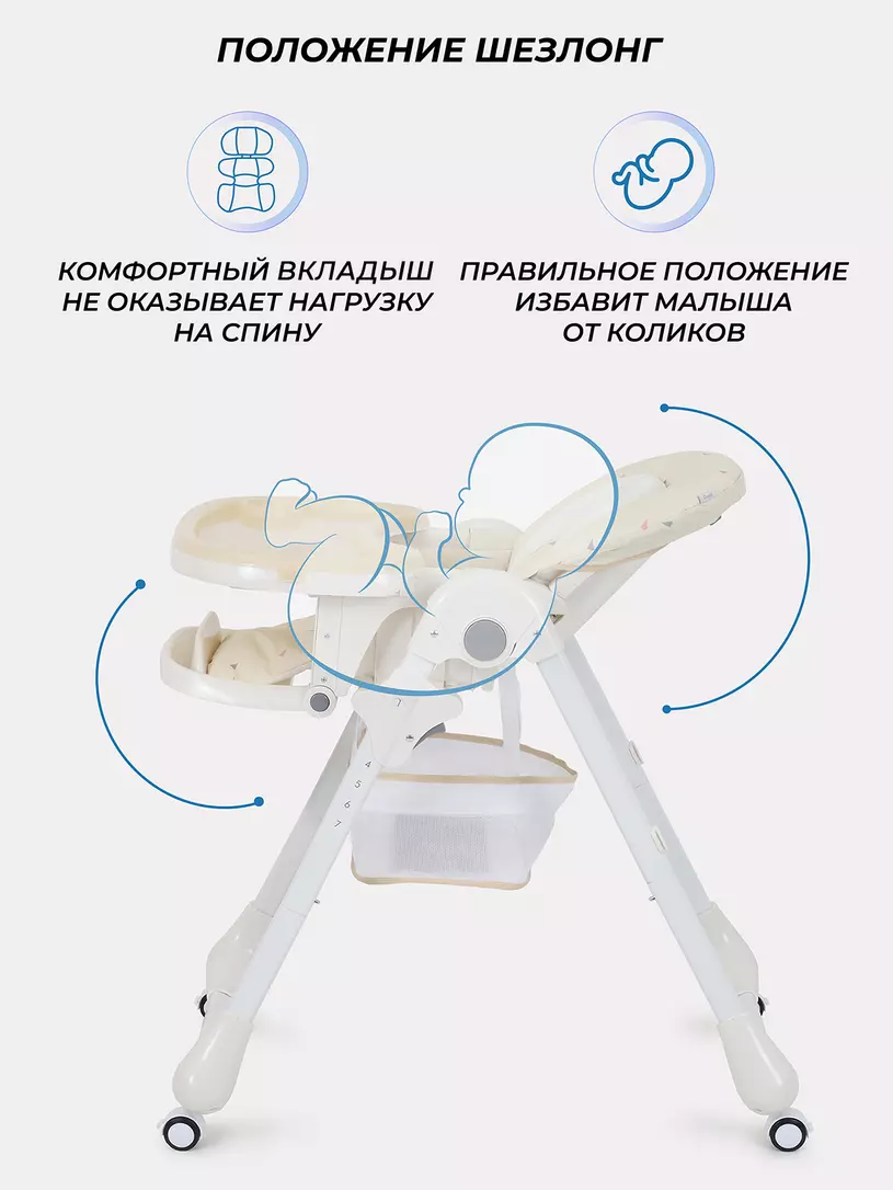 Детский стульчик для кормления RANT CREAM покорит вас: всеми необходимыми регулировками; двойной столешницей; возможностью зафиксировать столешницу на раме; колесиками со стопором; корзиной под сиденьем; компактным вертикальным хранением; мягким матрасиком-вкладышем; практичным чехлом из водоотталкивающего материала.