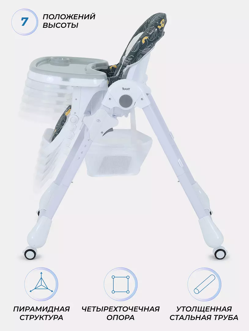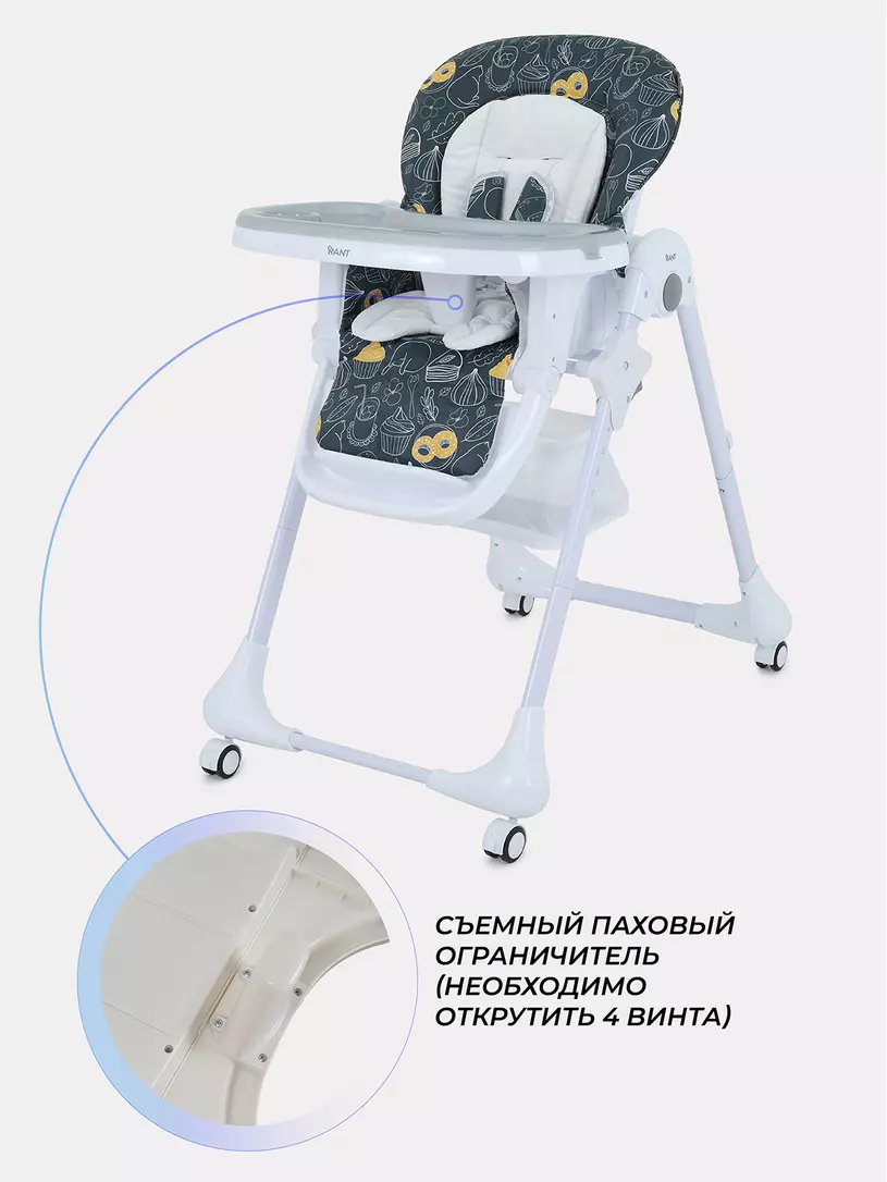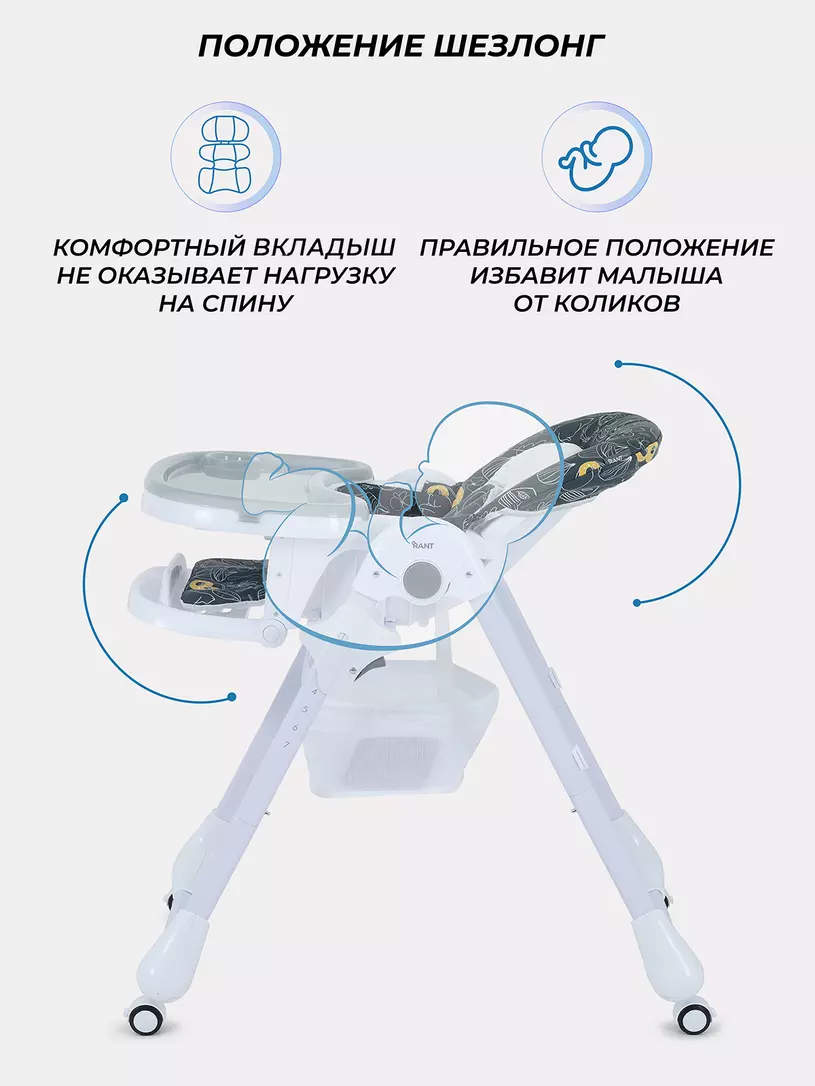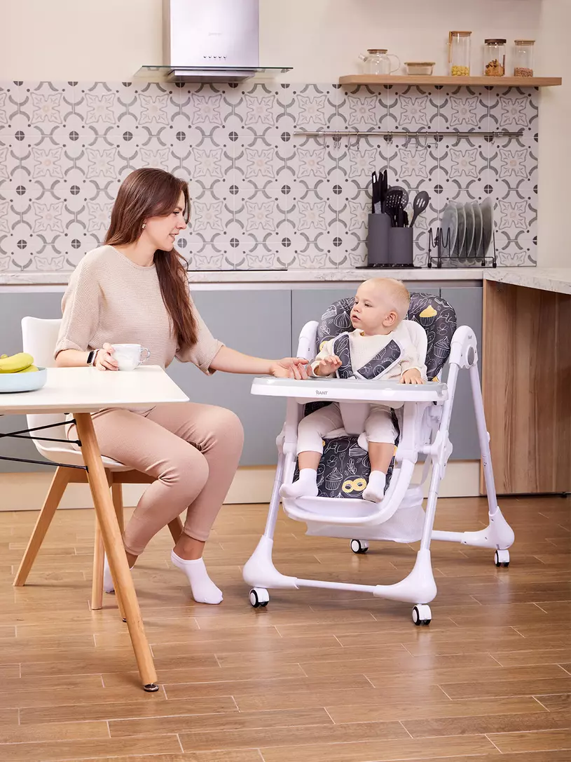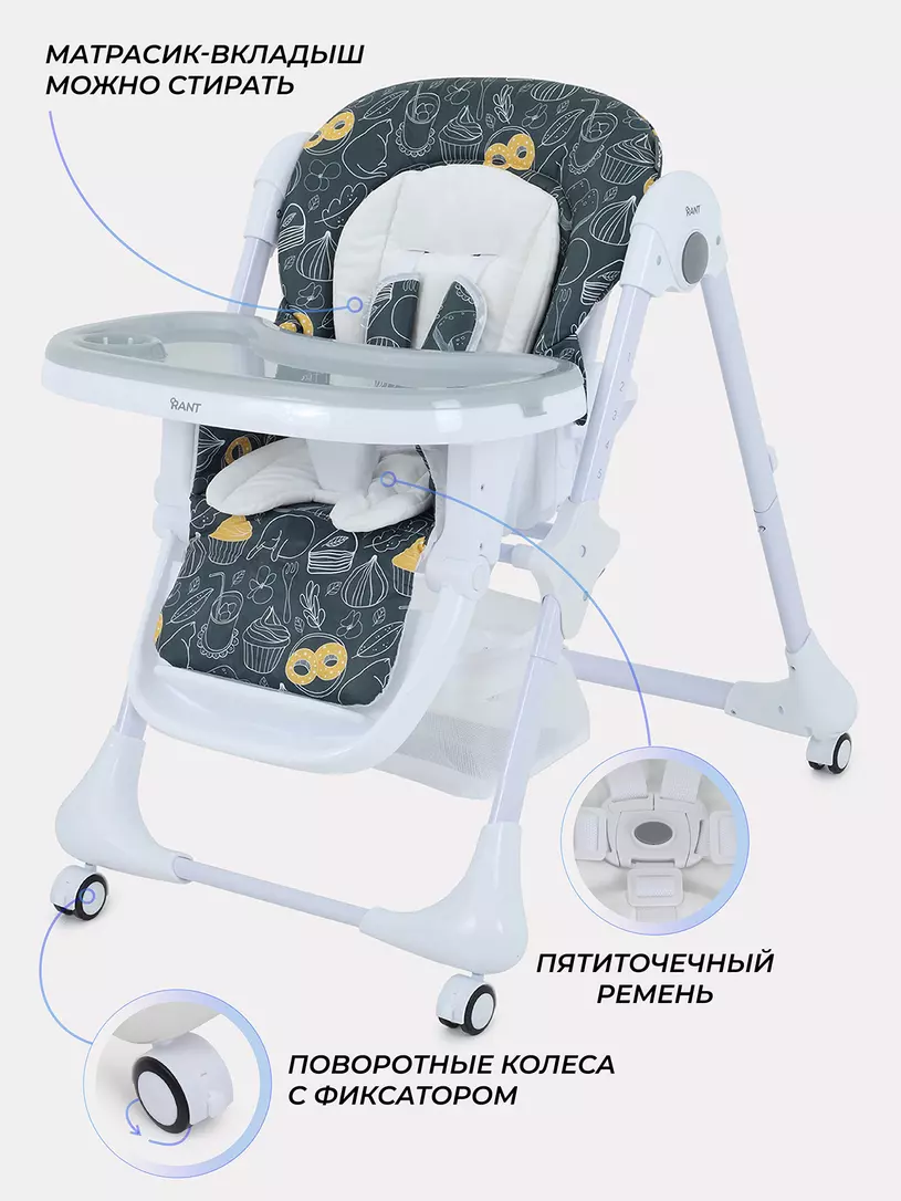 Детский стульчик для кормления RANT CREAM покорит вас: всеми необходимыми регулировками; двойной столешницей; возможностью зафиксировать столешницу на раме; колесиками со стопором; корзиной под сиденьем; компактным вертикальным хранением; мягким матрасиком-вкладышем; практичным чехлом из водоотталкивающего материала.