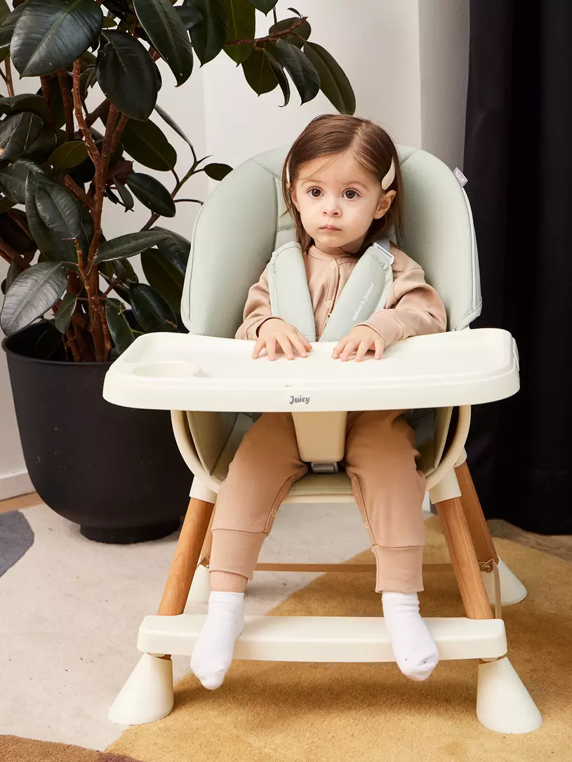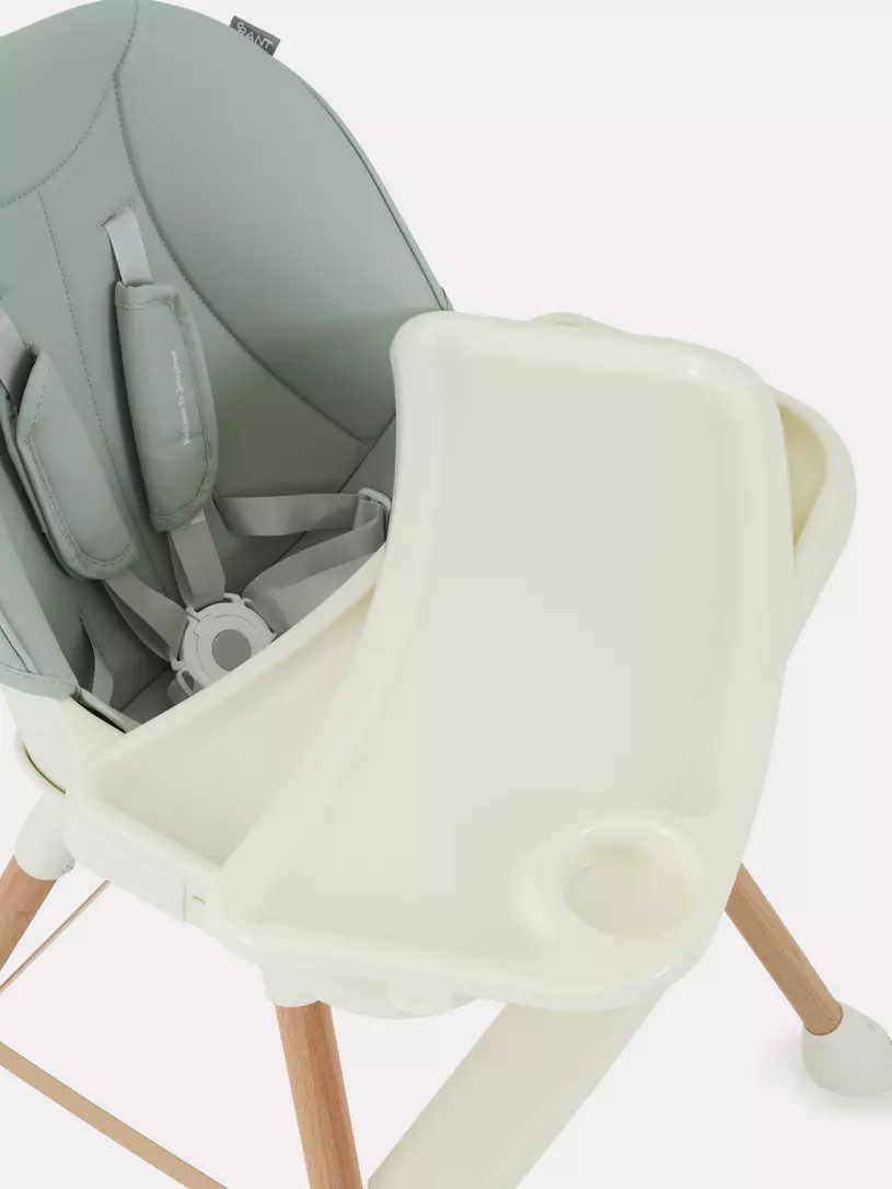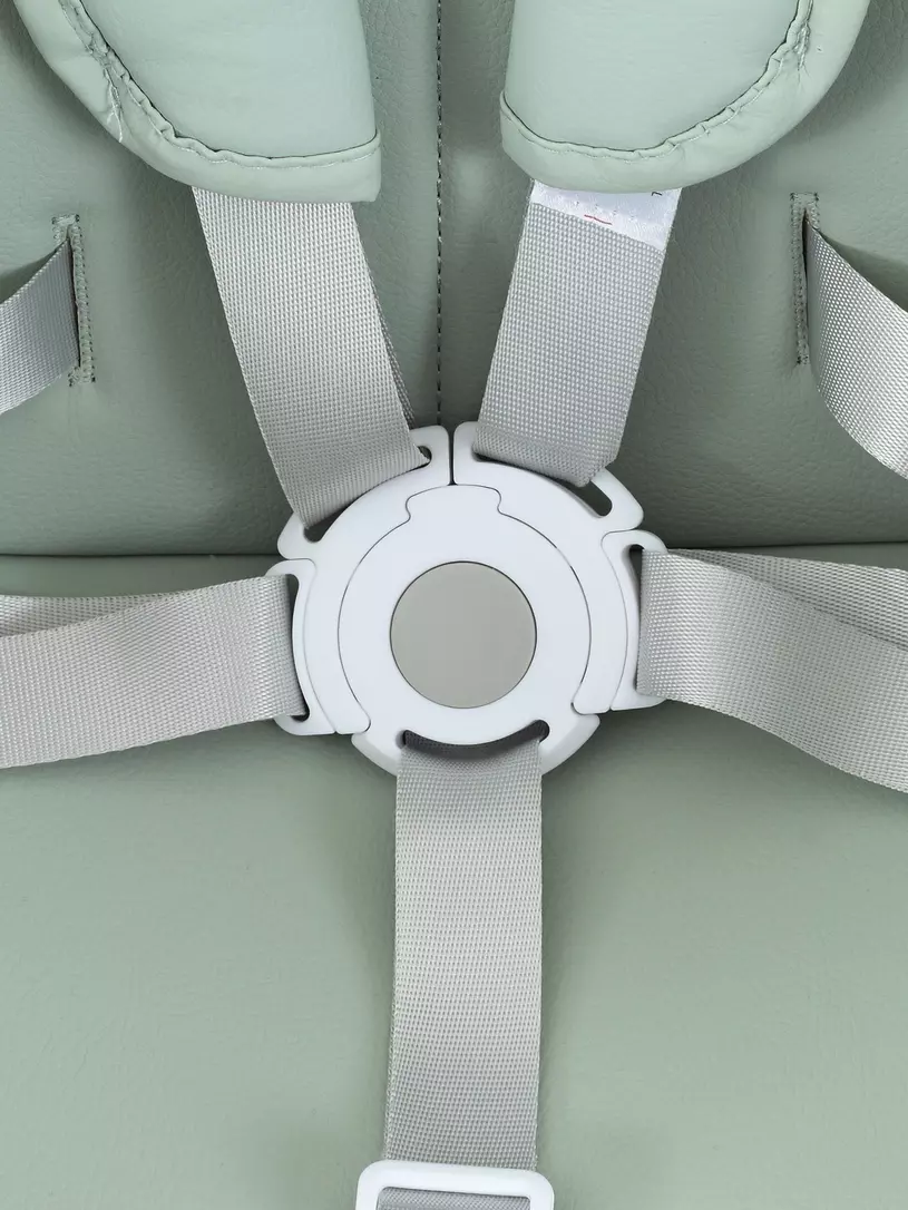 - 5-точечные, регулируемые ремни безопасности с мягкими накладками из экокожи надежно зафиксируют кроху во время трапезы