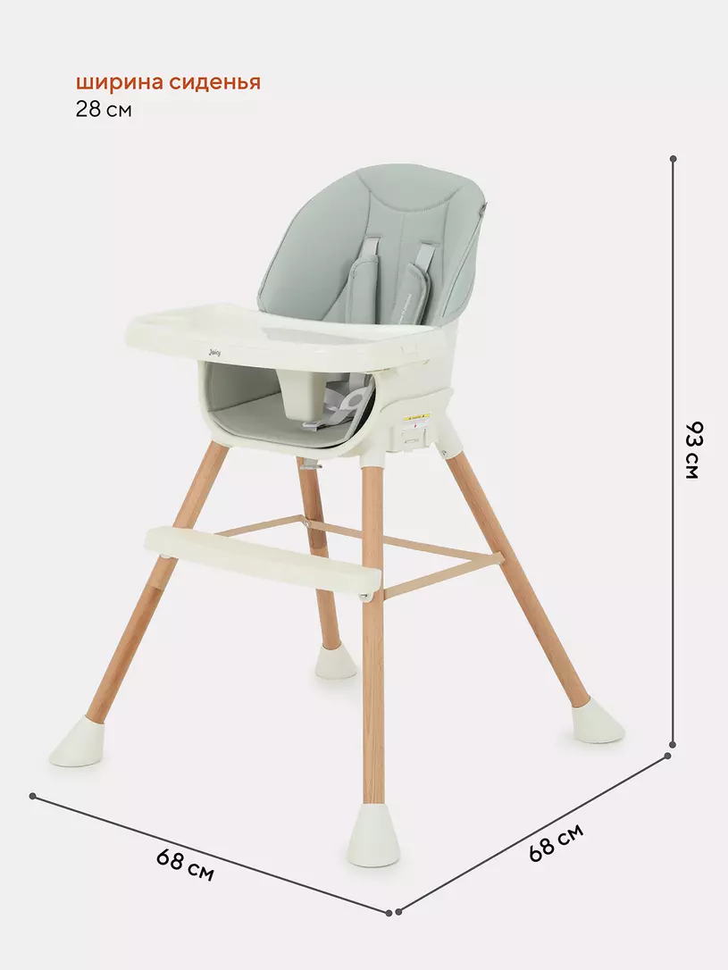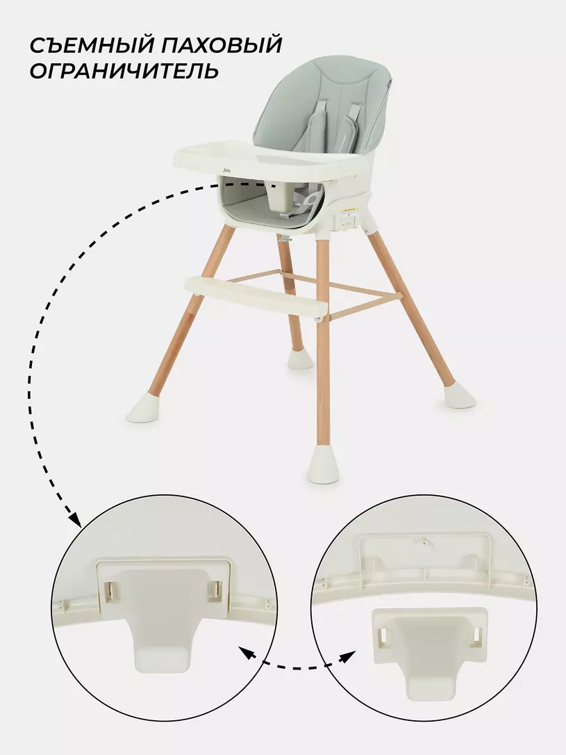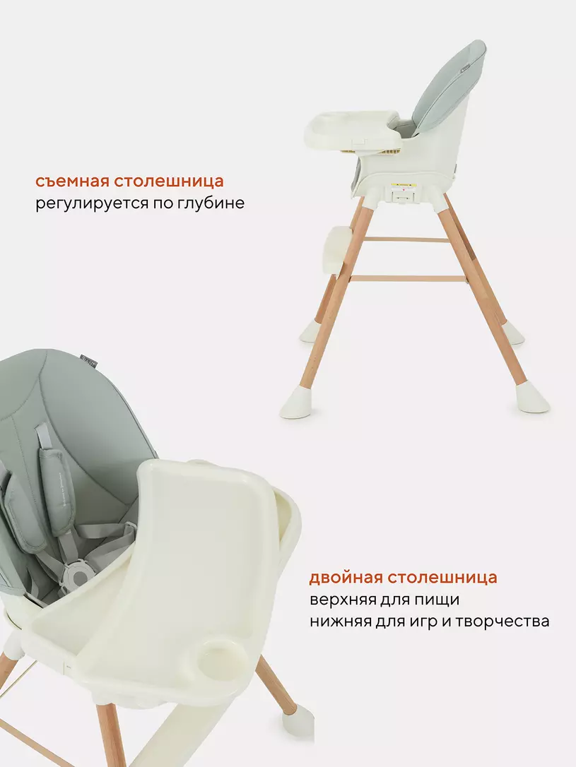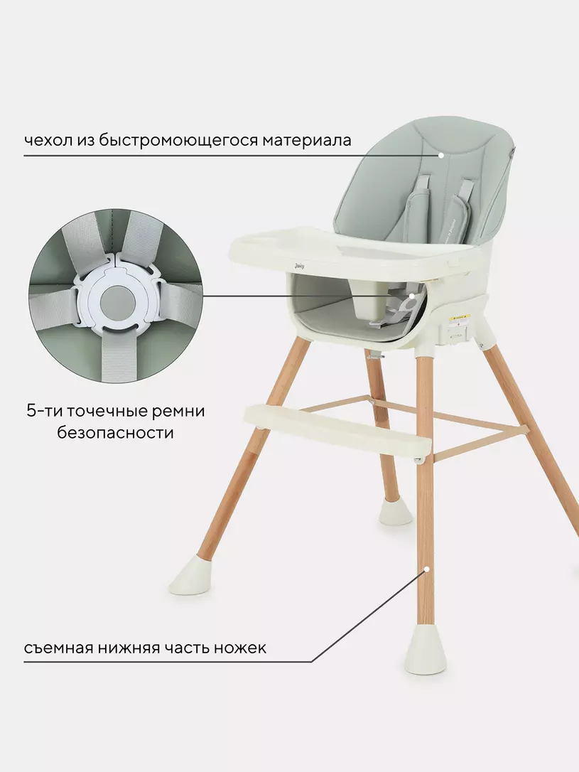 - 5-точечные, регулируемые ремни безопасности с мягкими накладками из экокожи надежно зафиксируют кроху во время трапезы