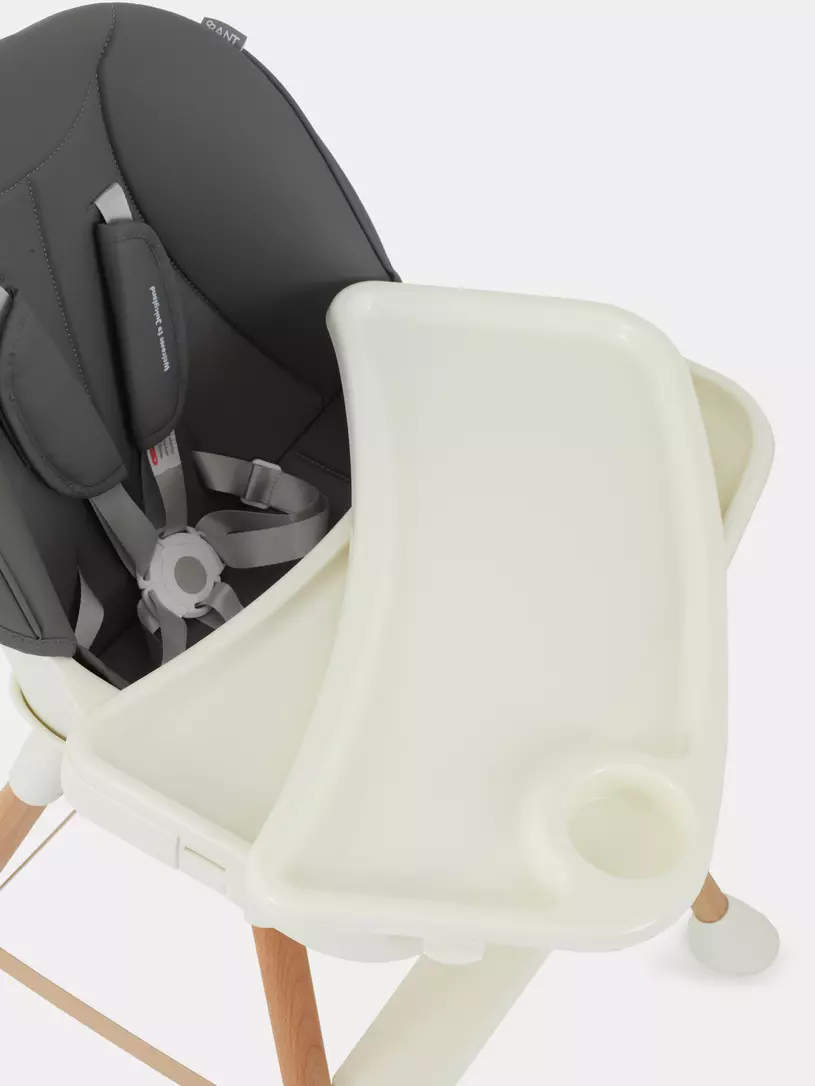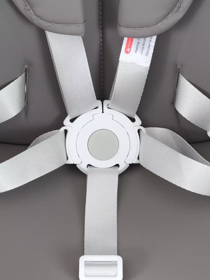 - 5-точечные, регулируемые ремни безопасности с мягкими накладками из экокожи надежно зафиксируют кроху во время трапезы