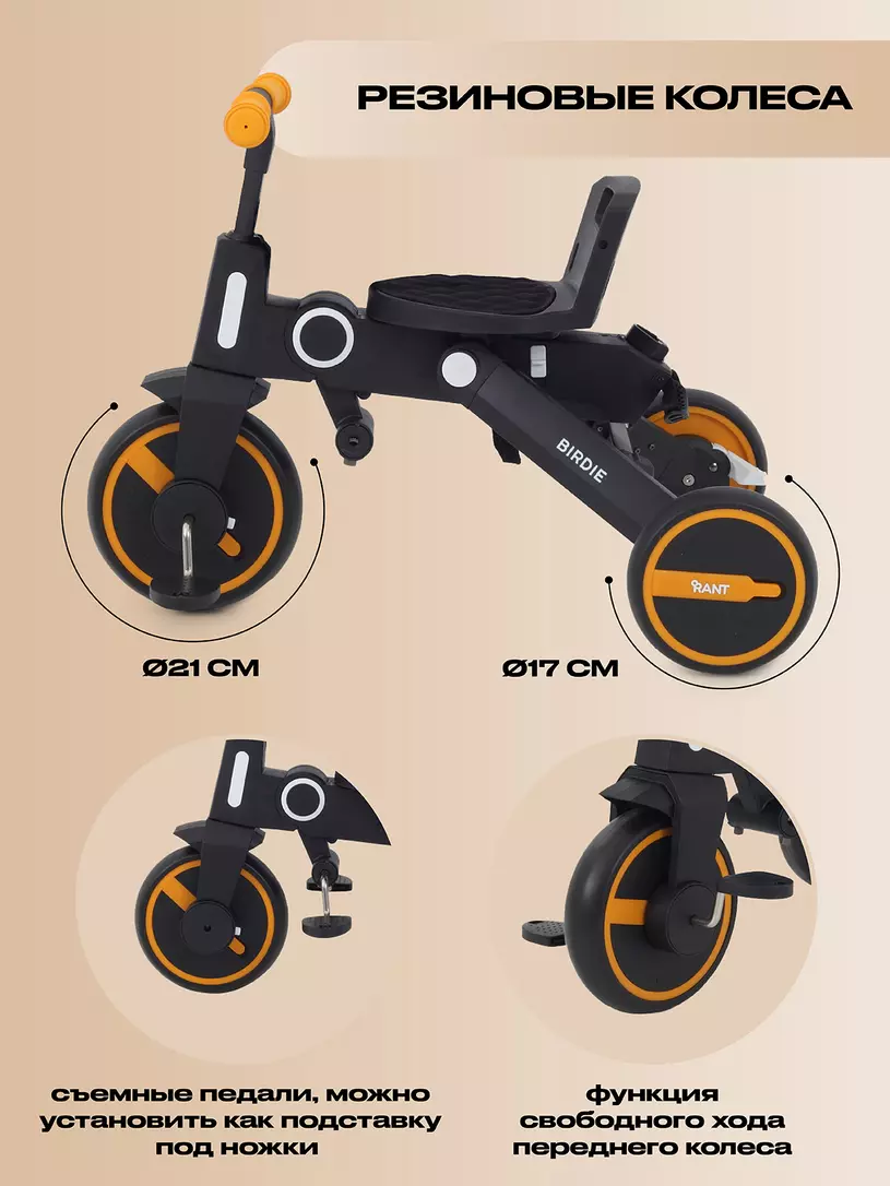 Детский велосипед с ручкой RANT BIRDIE обязательно оценит юный исследователь! Модель имеет 7! вариантов трансформации за счет съемных и складных элементов, а также складывается до мегакомпактного размера.